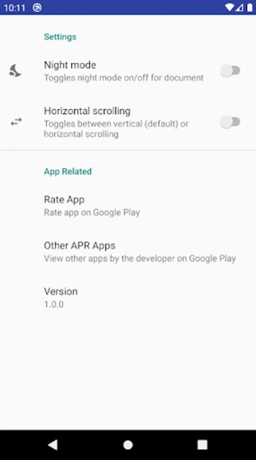 - Toggle between vertical scrolling (default) and horizontal scrolling of the document on the settings page.