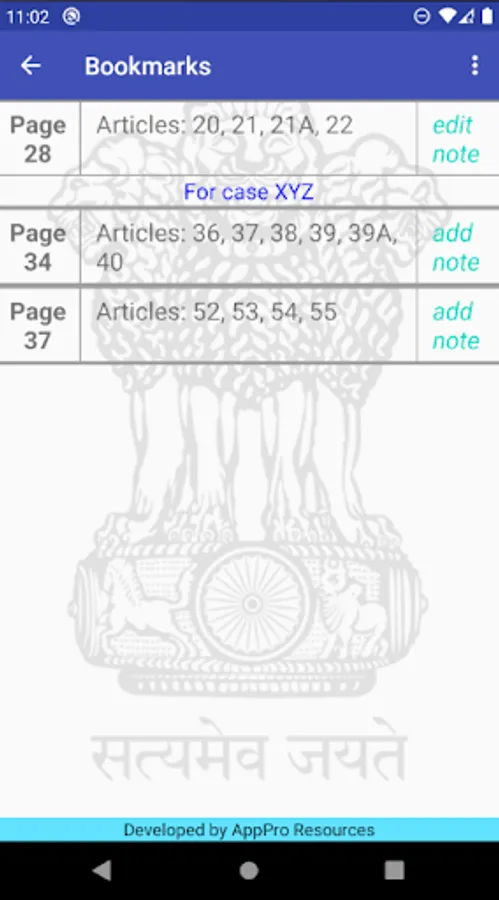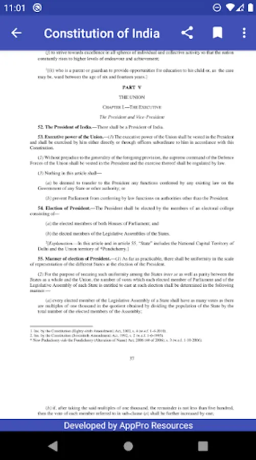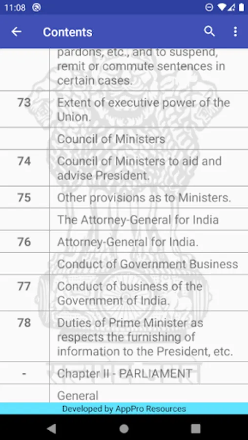 The app contains the Constitution of Republic of India in English. Users can browse through the article list and use that to immediately get to the specific article in the Constitution. The document can be zoomed in and out for easier viewing. Users can also take advantage of the share feature to instantly share contents of the screen with friends and family via messaging/email apps. All such contents are also saved on the user's device.