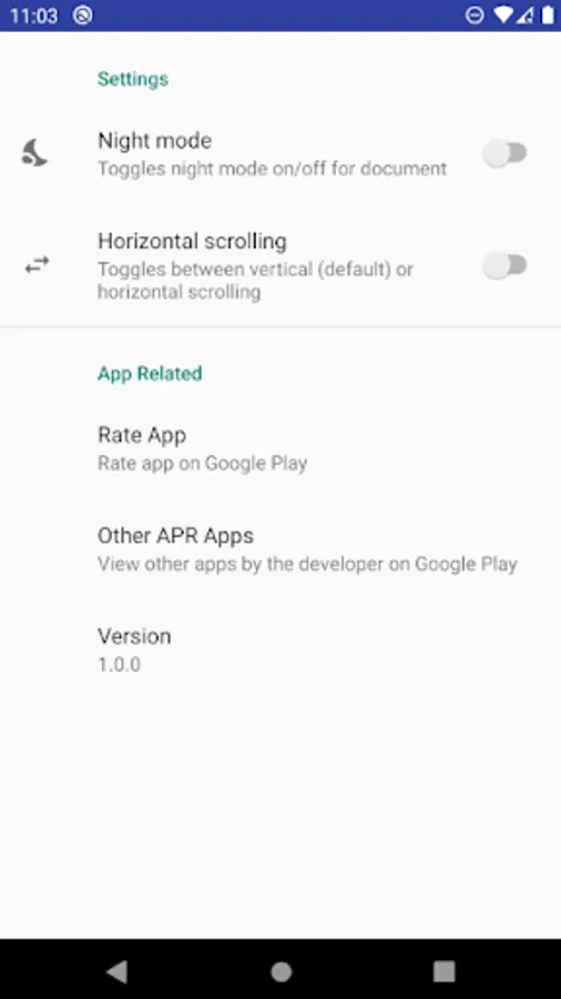 - Toggle between vertical scrolling (default) and horizontal scrolling of the document on the settings page.