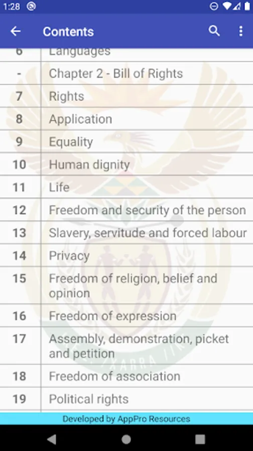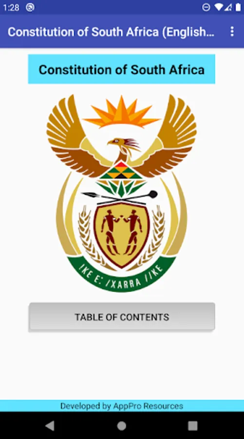 The Constitution of South Africa (English) - APR app is an application meant to serve as an educational, general and/or reference resource for users to learn about the Constitution of the Republic of South Africa in English.