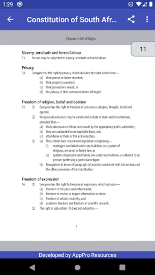 The app contains the Constitution of the Republic of South Africa in English. Users can browse through the article list and use that to immediately get to the specific article in the Constitution. The document can be zoomed in and out for easier viewing. Users can also take advantage of the share feature to instantly share contents of the screen with friends and family via messaging/email apps. All such contents are also saved on the user's device.