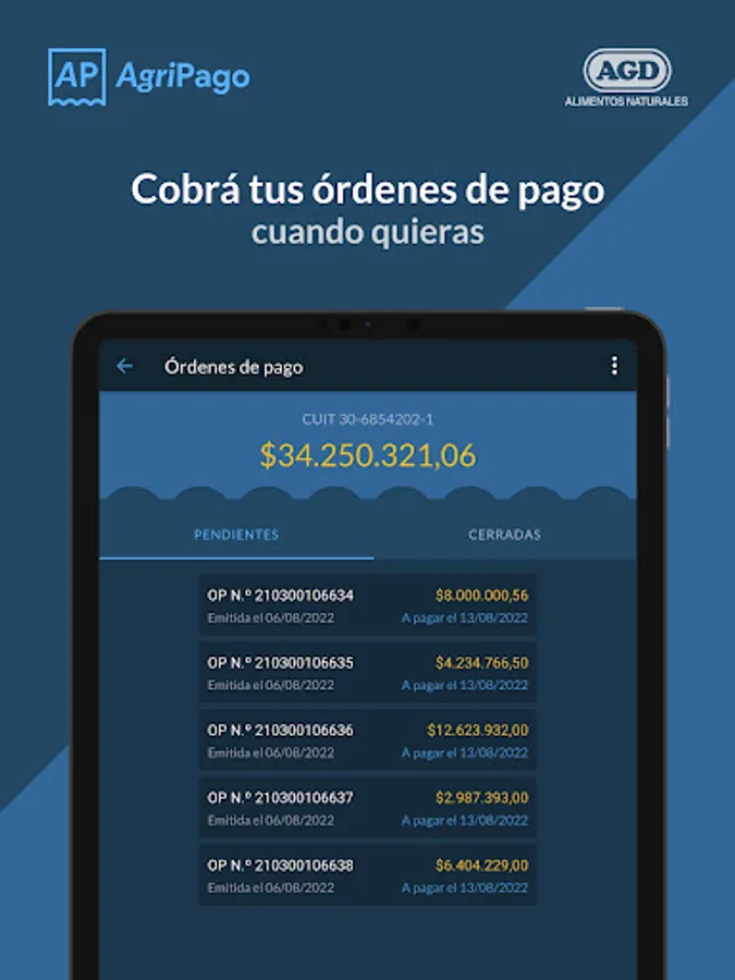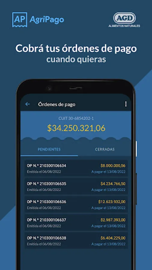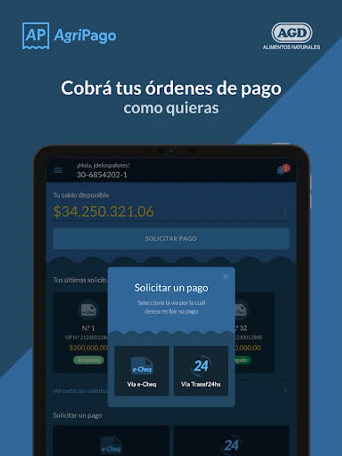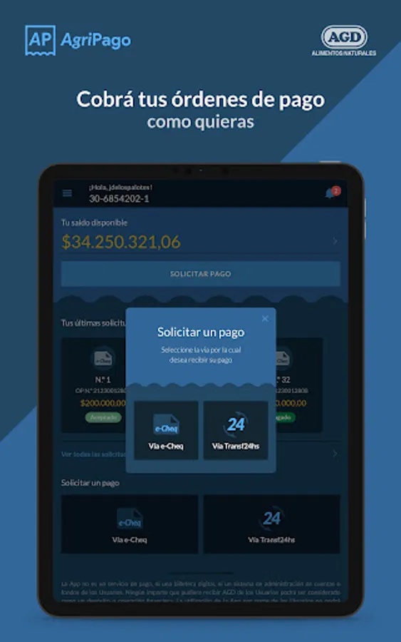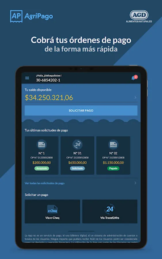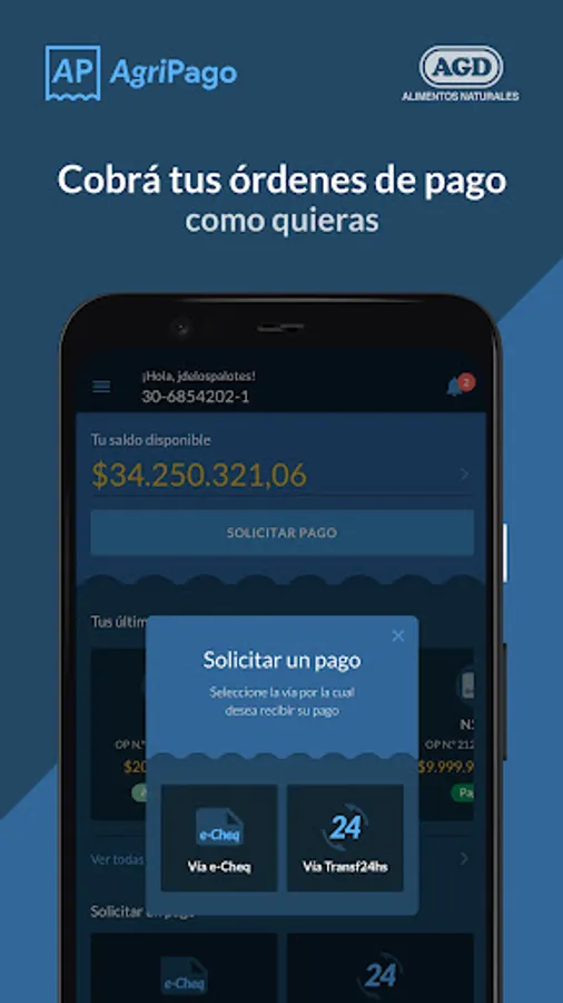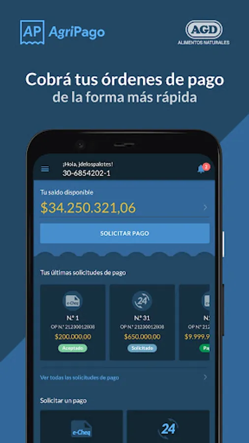 With this new app you can instruct your payments via electronic check (echeq) of the "to order" type or via electronic transfer of funds with a term "24 hours". It is very simple, select your payment order from Aceitera General Deheza S.A. (AGD) and you make your requests just by typing the amount you want to receive. In addition, you can check online your available balance, the history of your payment orders, the status of your payment requests, operate 7 days a week at any time and much more !!!