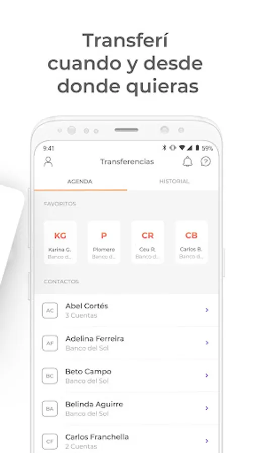 Transfer your contacts in seconds by alias, CVU, CBU and without the need for a coordinate card or token. Filter your scheduled contacts in the search engine, choose who you want to make a transfer to, and that's it!