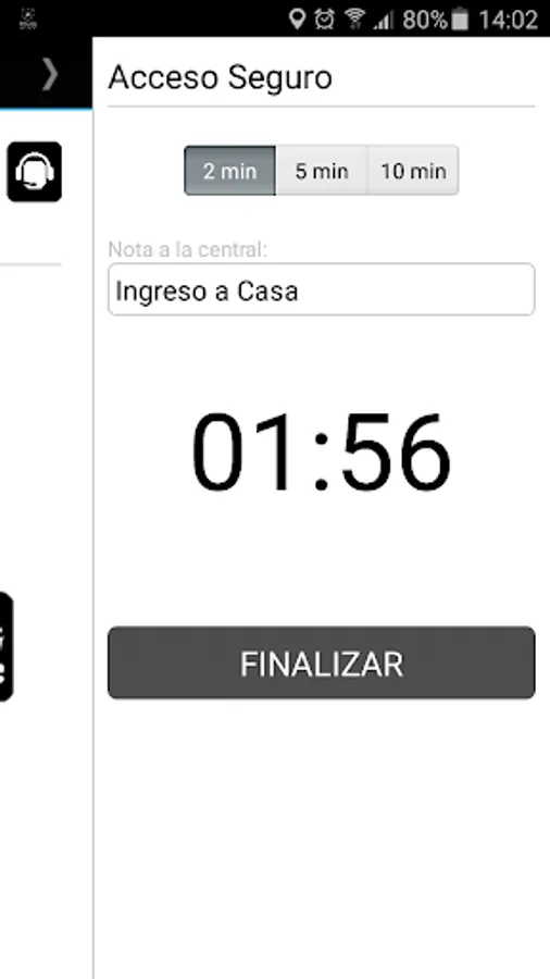 SAFE ACCESS. POLICE SECURITY includes this functionality that provides tranquility and security in potentially hazardous situations, such as access to your home, car or business, or any situation of temporary insecurity. When you start the process of accessing the address set a reasonable time for this action (2, 5 or 10 minutes). Once this time, if the client confirms NO access, SECURITY POLICE AUTOMATICALLY generates an alert for the operator of the central monitoring station.