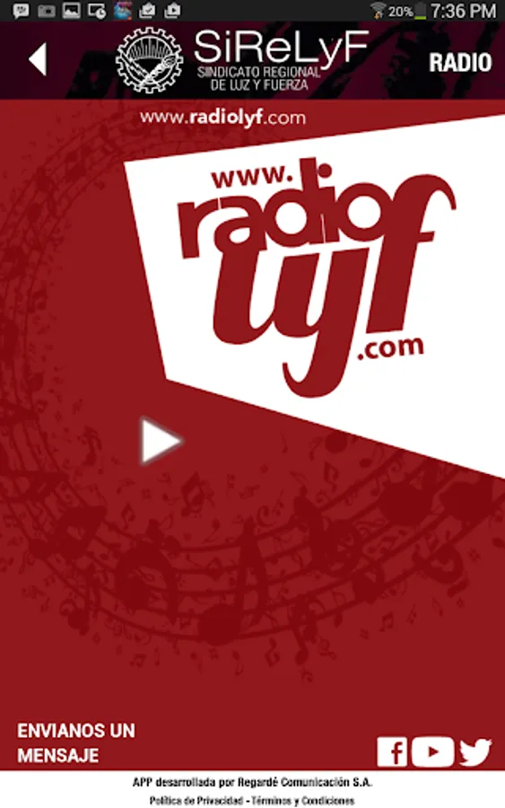 In the first (NEWS), you can access news, daily, they are charged on social networks where members can interact with opinions and share news that is of interest. On the second tab (RADIO), you access the contents of RadioLyF and all social media networks and radio contact, where you can send messages or orders directly from the application. In this section you can start and pause the radio transmission by tapping the play button.