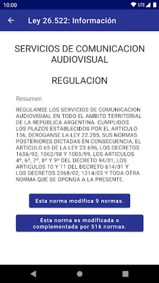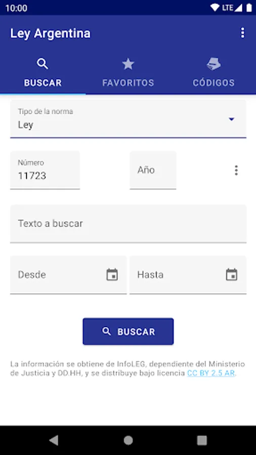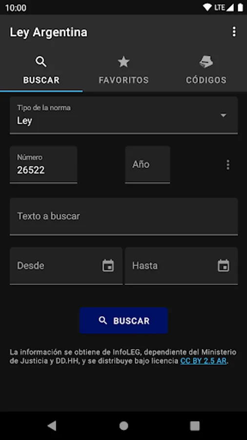 All the law information comes from the InfoLEG site and the content, therefore, is under the license terms of that site. The application accesses InfoLEG as if it were a normal web browser interpreting the site. Any change in it breaks it (it is very rare) until I run to update it.