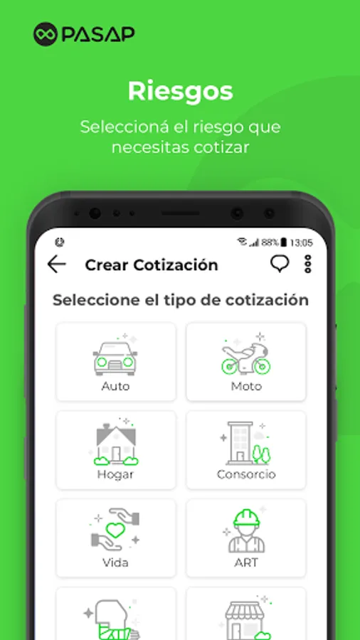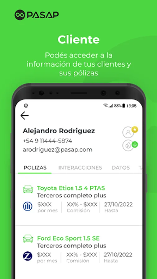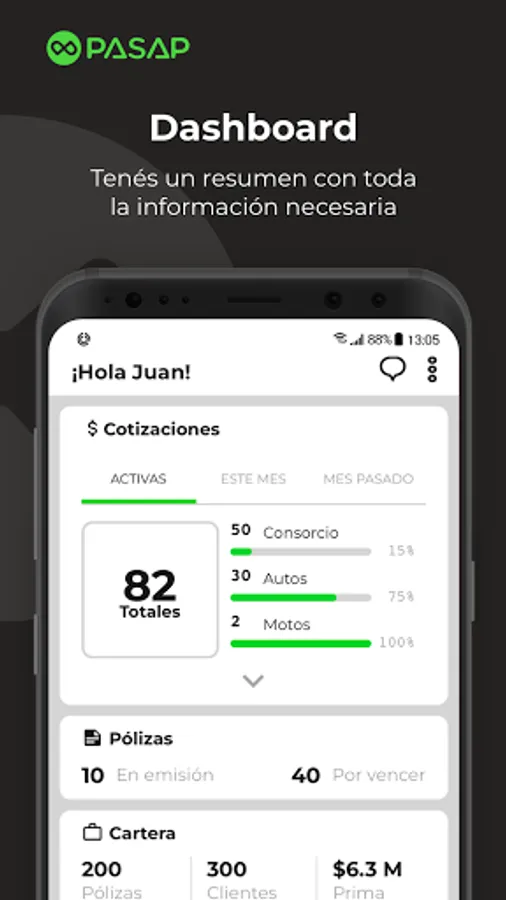 PASAP, the best application for insurance consultant producers. Our innovative platform allows you to manage your entire business from one place and connect automatically with the main insurance companies in the Argentine market. Quote, issue and manage all policies.