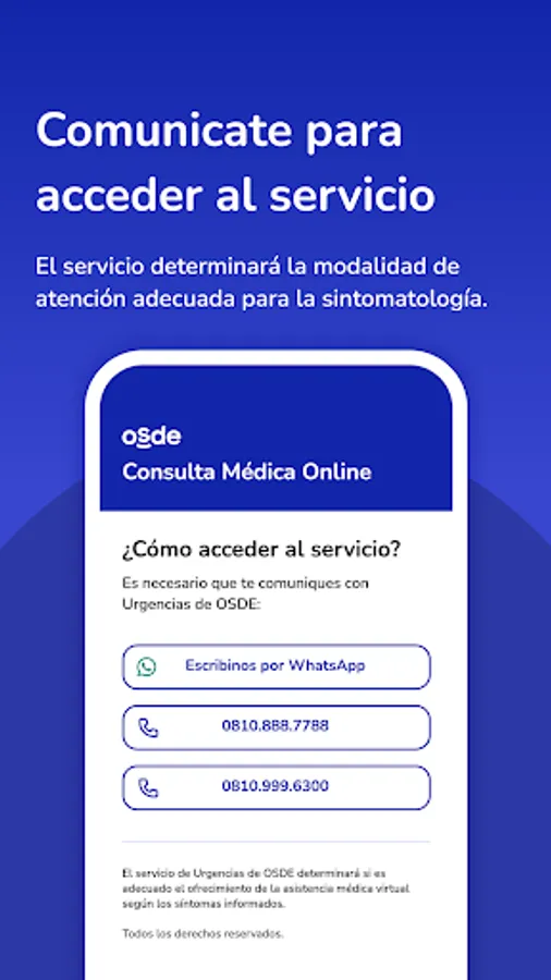 OSDE CMO is an application that allows OSDE to offer its members virtual medical assistance through any mobile device for those cases that are relevant. This service channel will only be provided to those who have previously communicated with the Emergency service at 0810-888-7788 / 0810-999-6300, by WhatsApp at +5491148729100 or through OSDE Móvil.