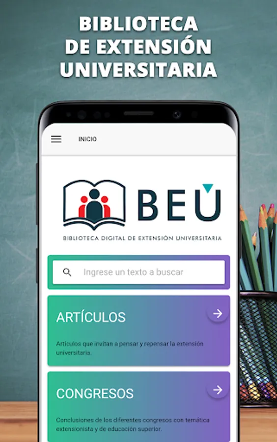 The University Extension Library (BEU) is a digital repository of articles, magazines and books, registered within the framework of the repository system of the Central Library of the National University of the Center of the Province of Buenos Aires (UNICEN), which complies with the guidelines established by the National System of Digital Repositories (SNRD).