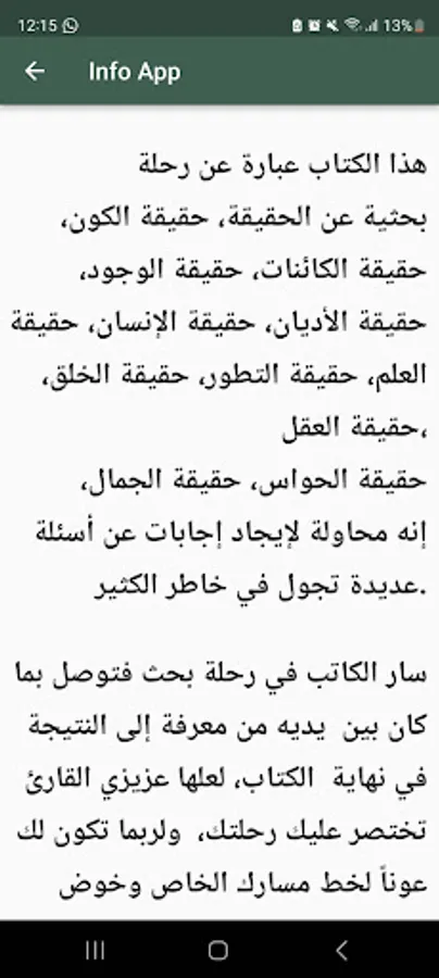 هذا الكتاب عبارة عن رحلة بحثية عن الحقيقة، حقيقة الكون، حقيقة الكائنات، حقيقة الوجود، حقيقة الأديان، حقيقة الإنسان، حقيقة العلم، حقيقة التطور، حقيقة الخلق، حقيقة العقل،