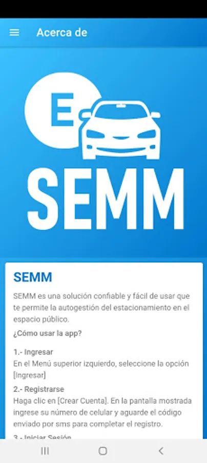 Once the app is downloaded, the user only registers with their phone number and email address. No other personal data is required or stored. By way of validation, the system sends a code via SMS to be used for the only and first time as an "access key" to the SEMM.
