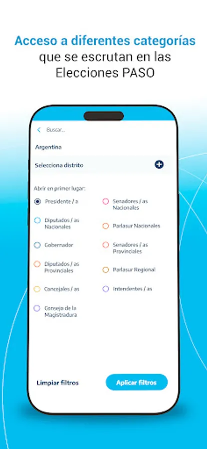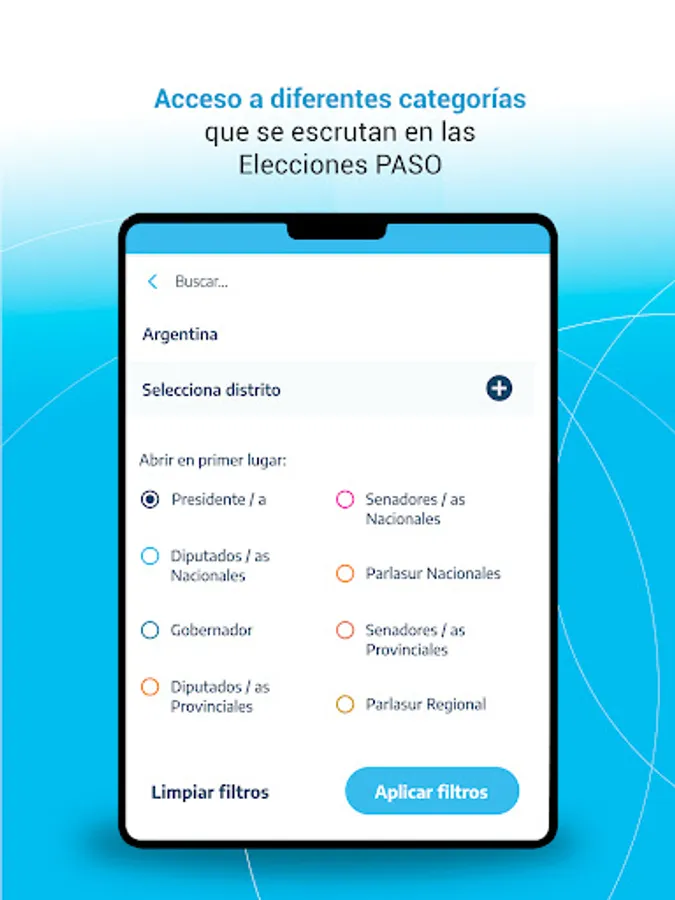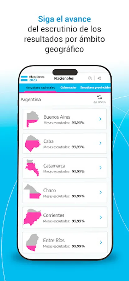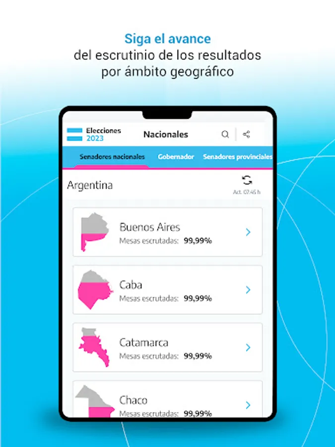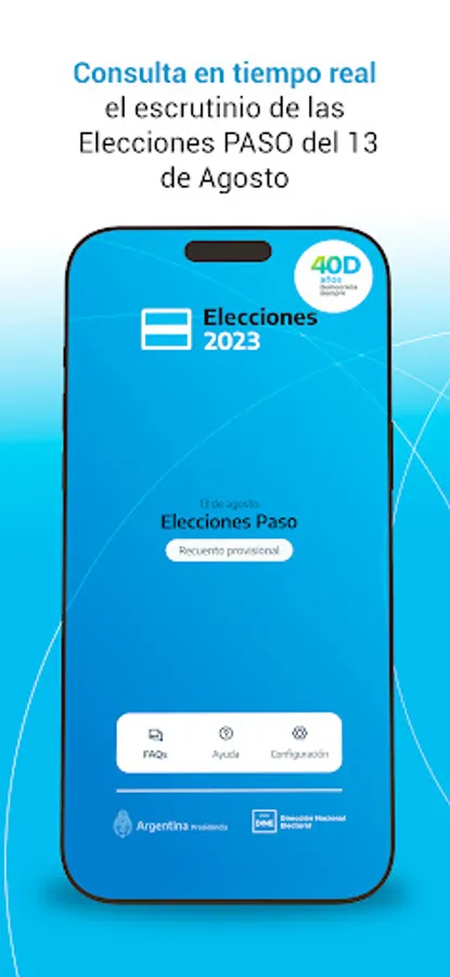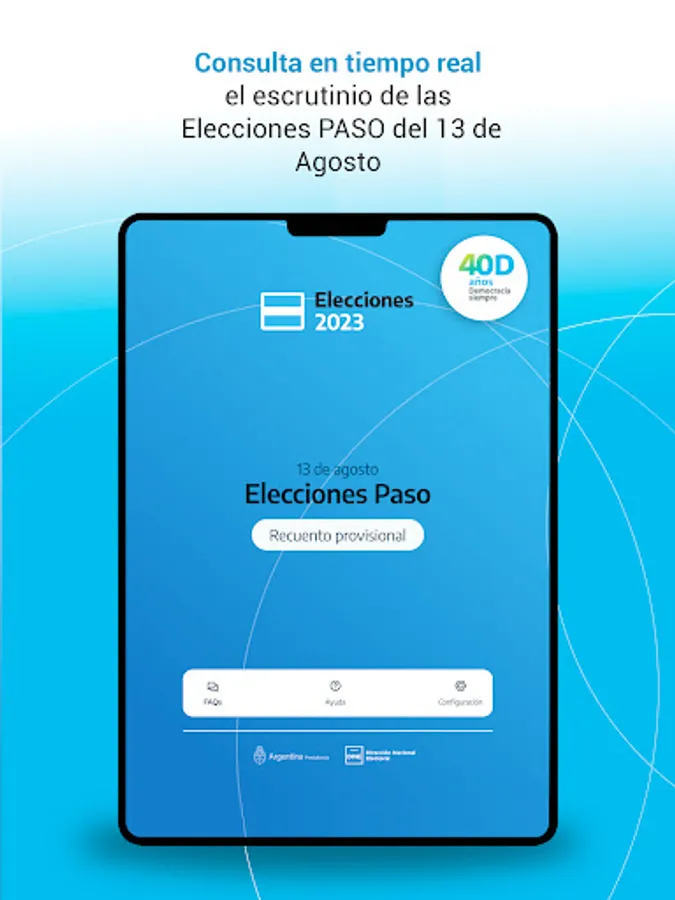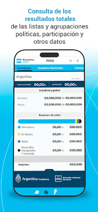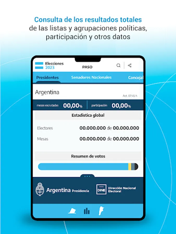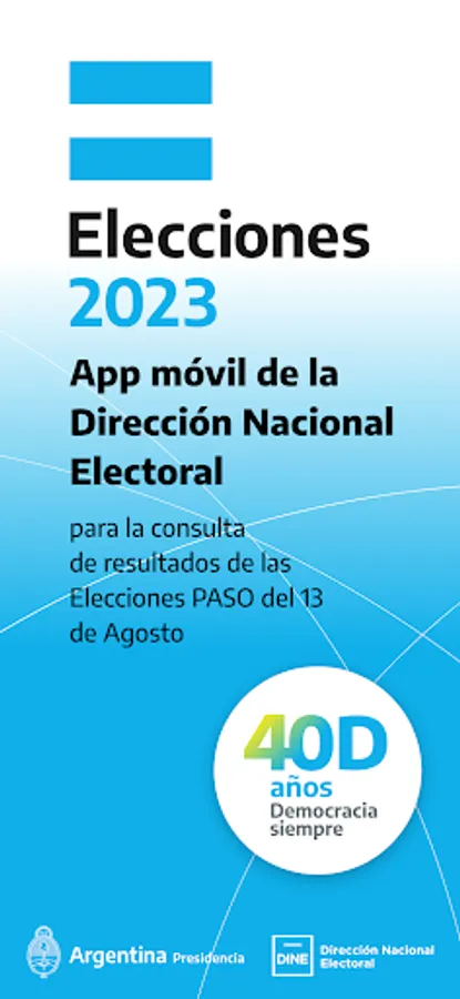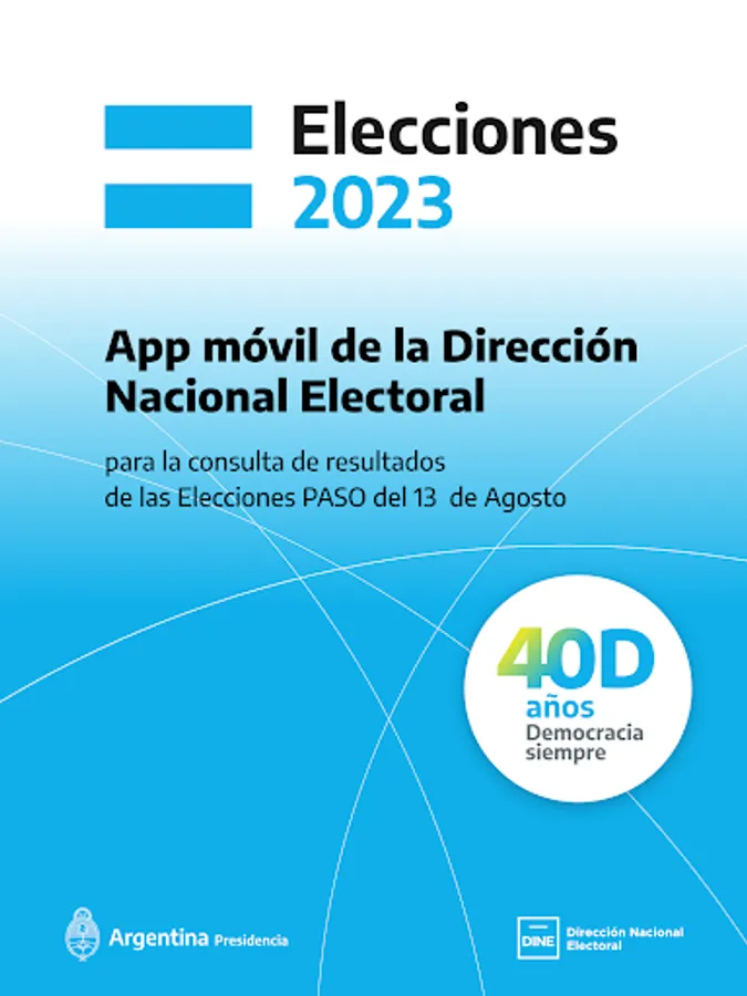 Elections Argentina 2023 is the official application of the Ministry of the Interior, which allows you to consult the provisional count of the PASO elections of August 13 and the Presidential elections of October 22, 2023. It allows you to consult the results obtained by political groups, classifying by electoral category and geographic scope (electoral district, section, circuit, polling place and polling station).
