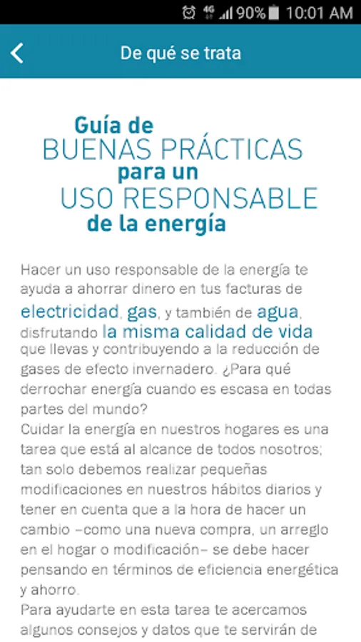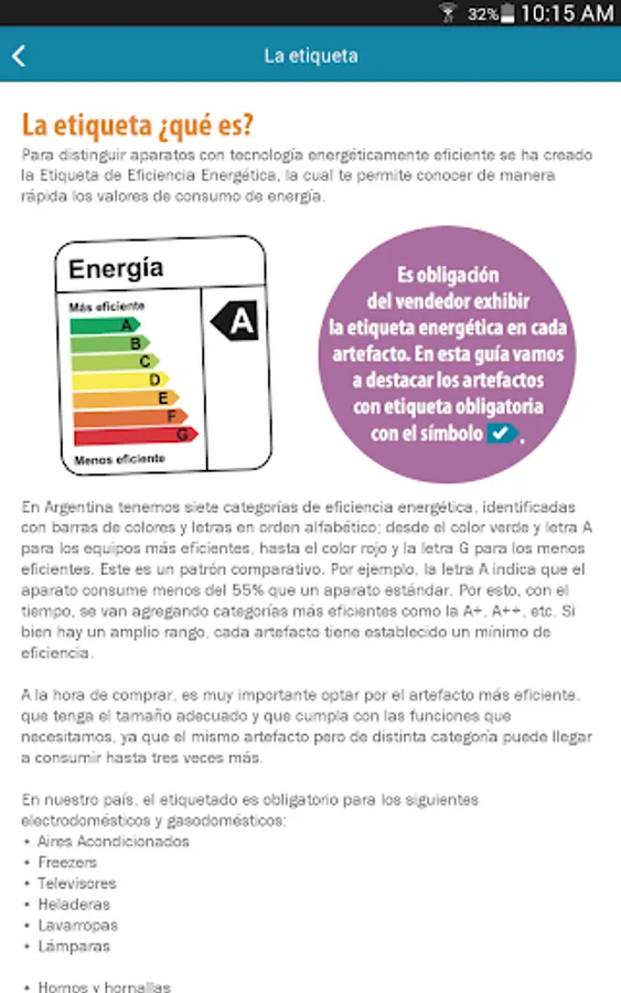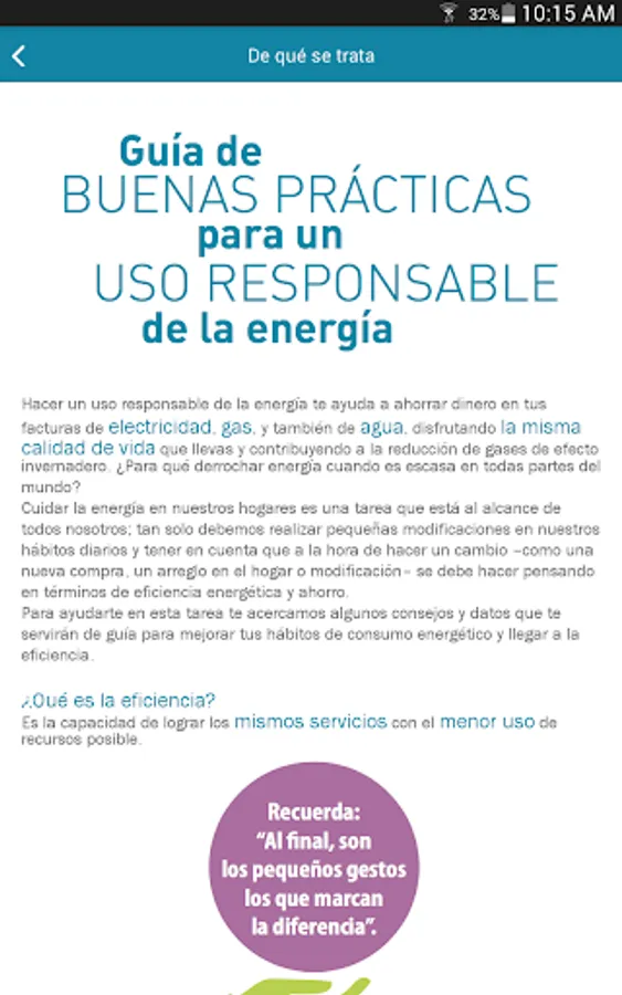Energy-Efficiency Tips application is a guide of good practices for responsible use of energy in homes and useful tips to save electricity, gas and water and start thinking about improving our consumer behavior information use. It is aimed at residential users of these services in Argentina and persons responsible for their payment. The guide also offers basic and interest when making decisions regarding the purchase of gas appliances and appliances, the use of materials of building construction, home improvements and renovations information. It also has an introduction to aspects related to the efficient vehicular driving.