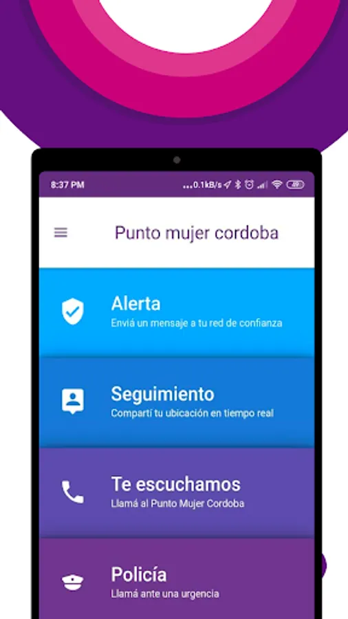 The app is in an initial trial version to receive suggestions from users. Punto Mujer Córdoba is a practical and free tool to alert your circle of trust when you feel in danger, to publicize your location or communicate with the police. It also provides useful information related to situations of violence.