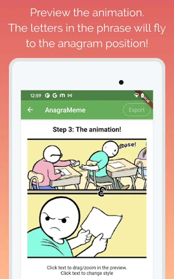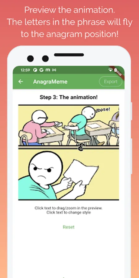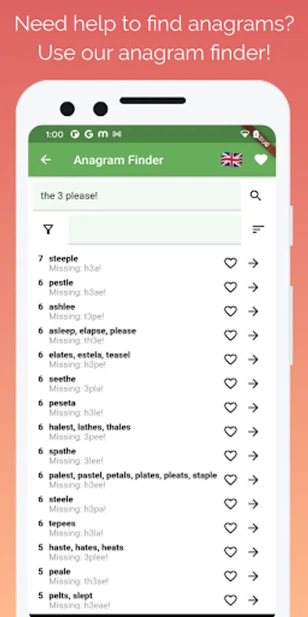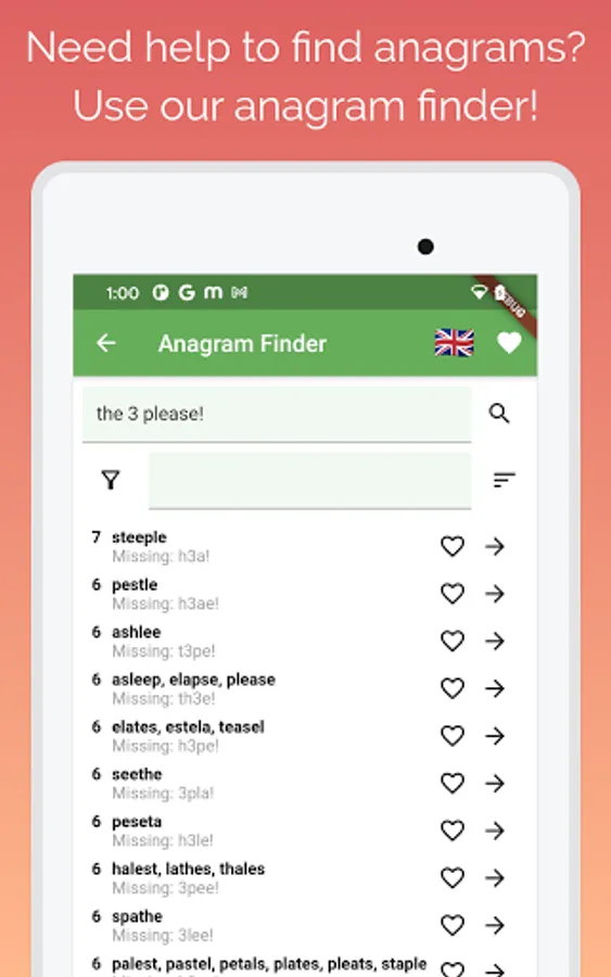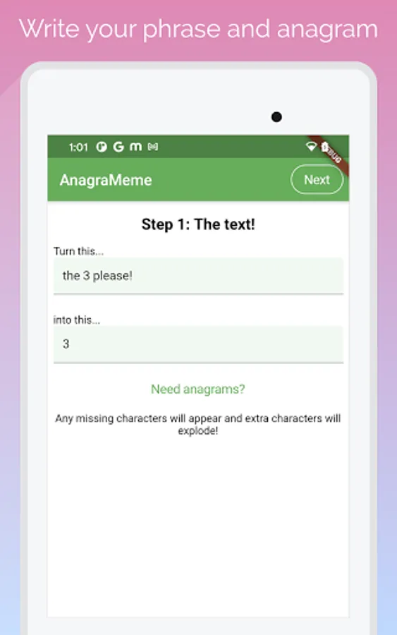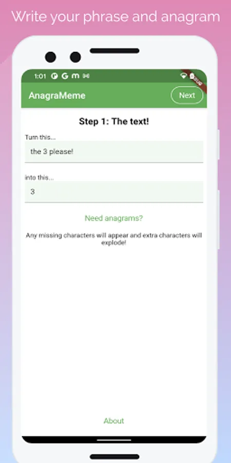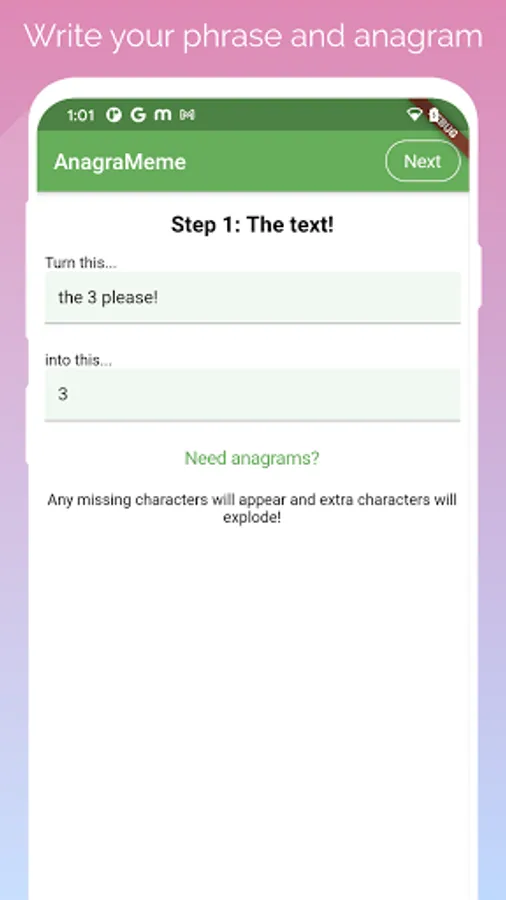 Create funny messages using anagrams! The letters of your message will move from one paragraph to the other. An anagram finder is included in the app to help you find the best words.
