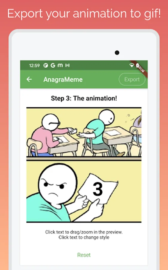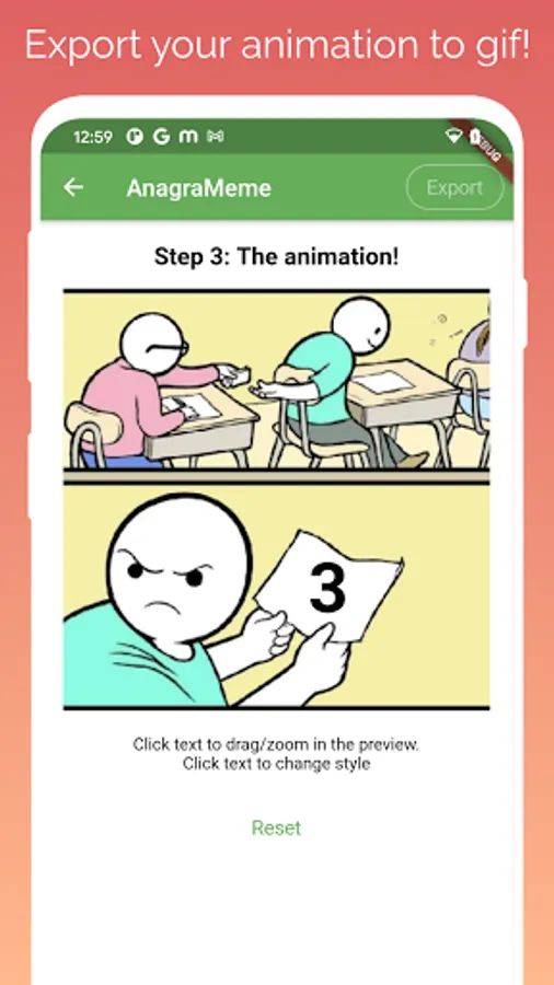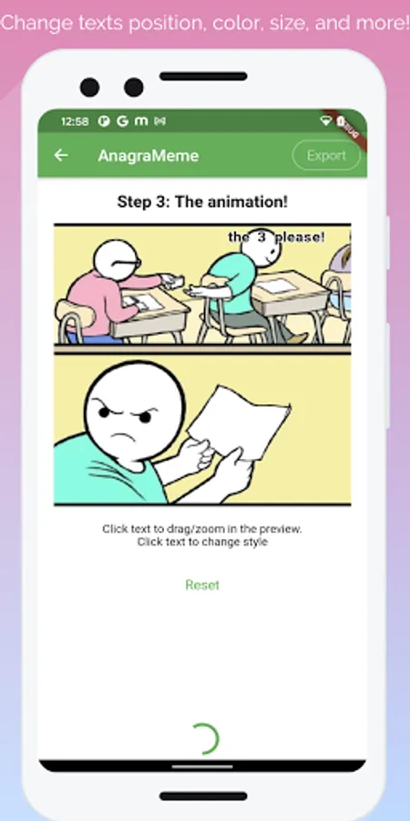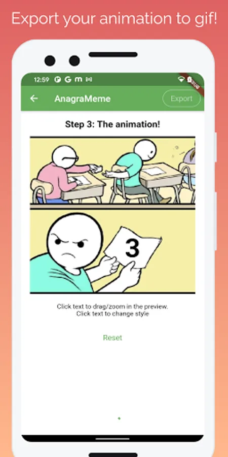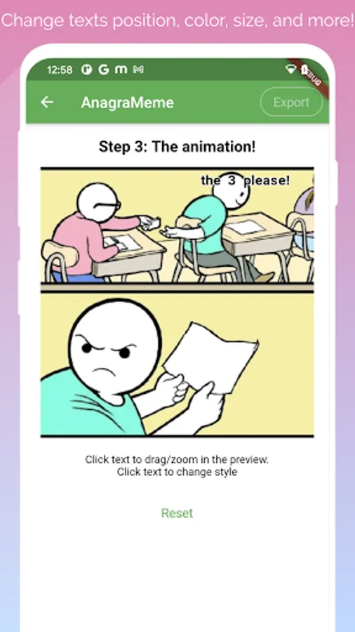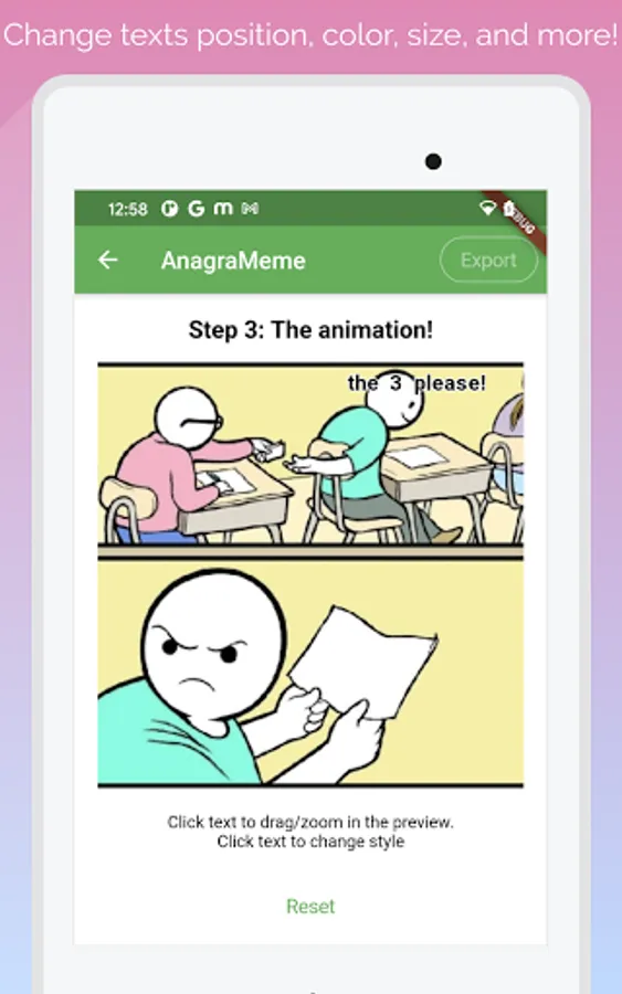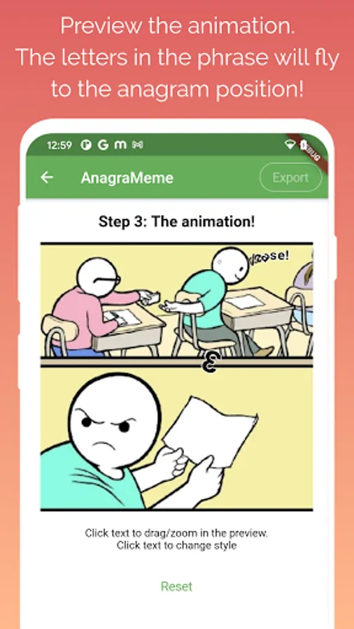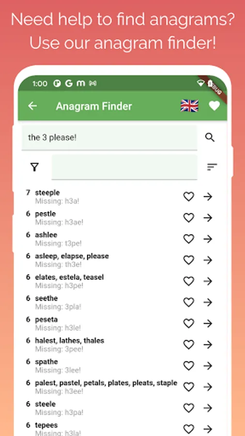 Create funny messages using anagrams! The letters of your message will move from one paragraph to the other. An anagram finder is included in the app to help you find the best words.