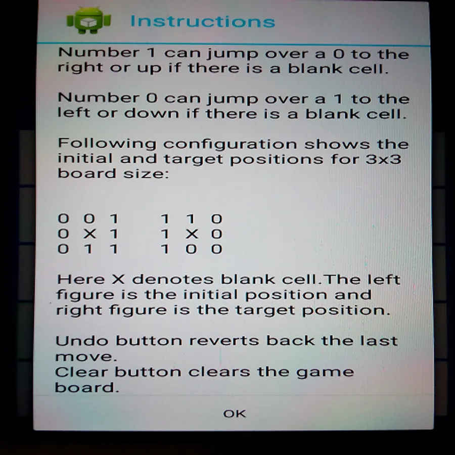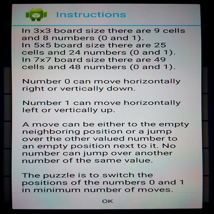 The puzzle is to switch the positions of the numbers 0 and 1 in minimum number of moves.