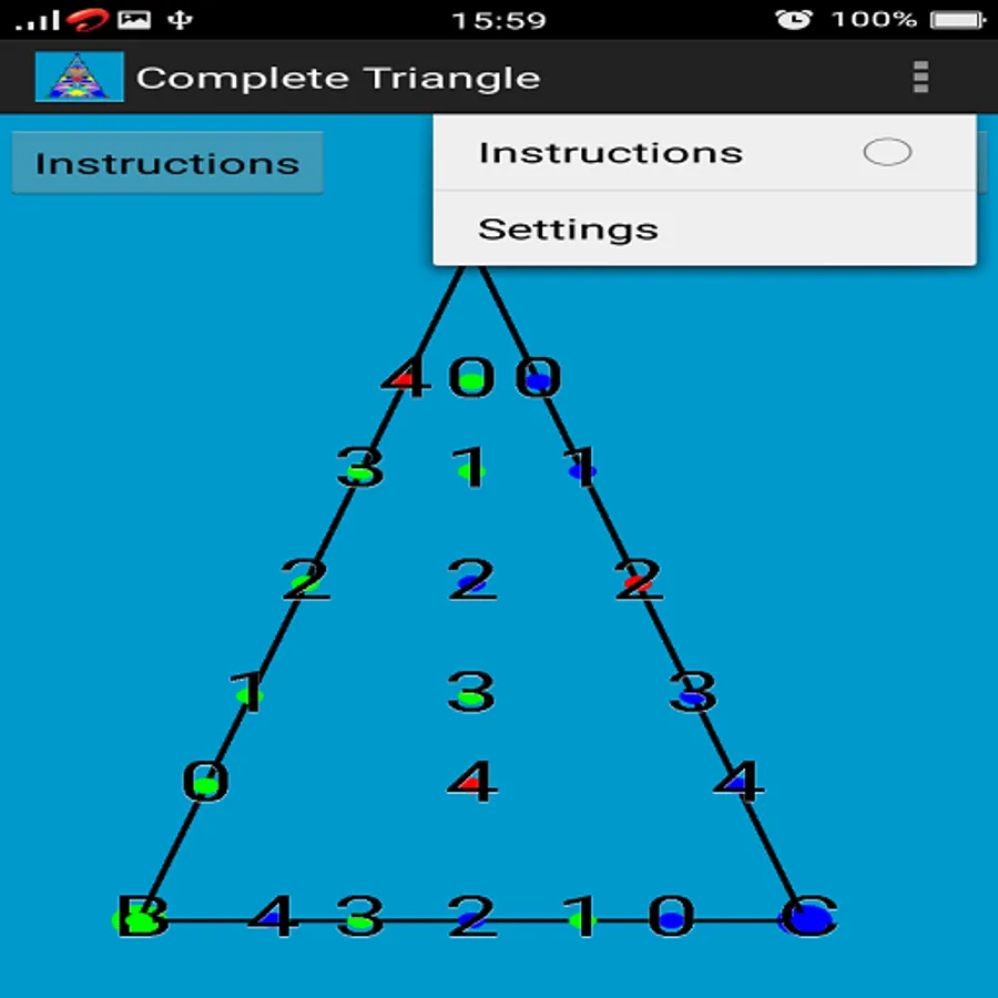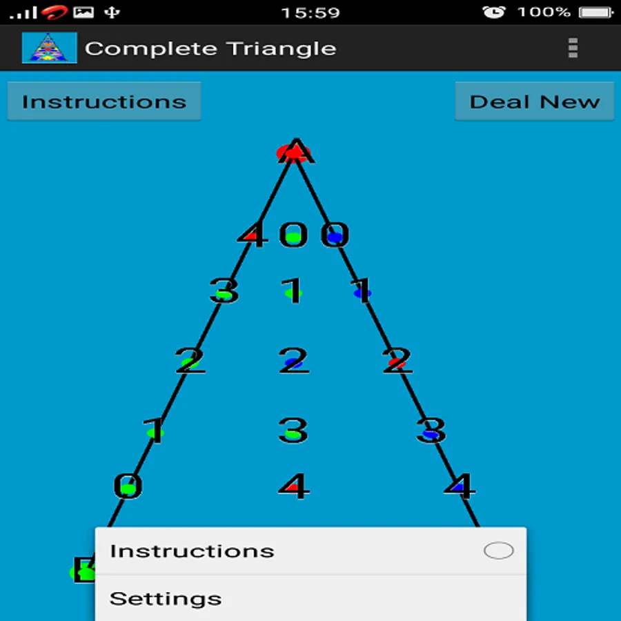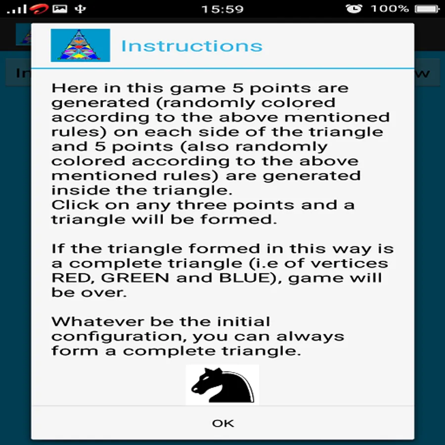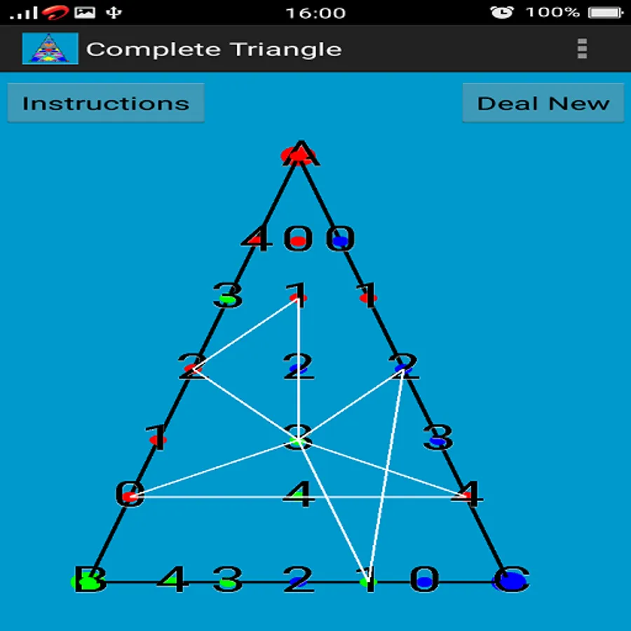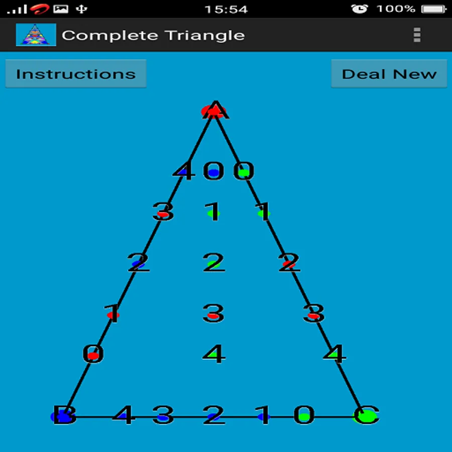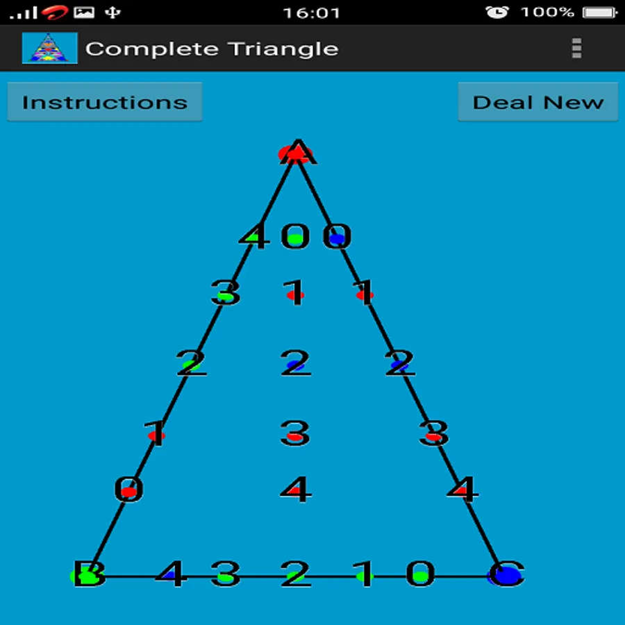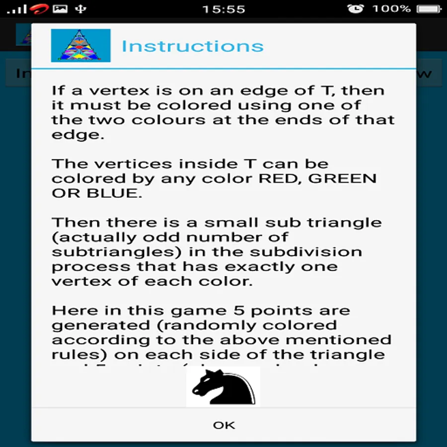 Here in this game 5 points are generated (randomly colored according to the above mentioned rules) on each side of the triangle and 5 points (also randomly colored according to the above mentioned rules) are generated inside the triangle.