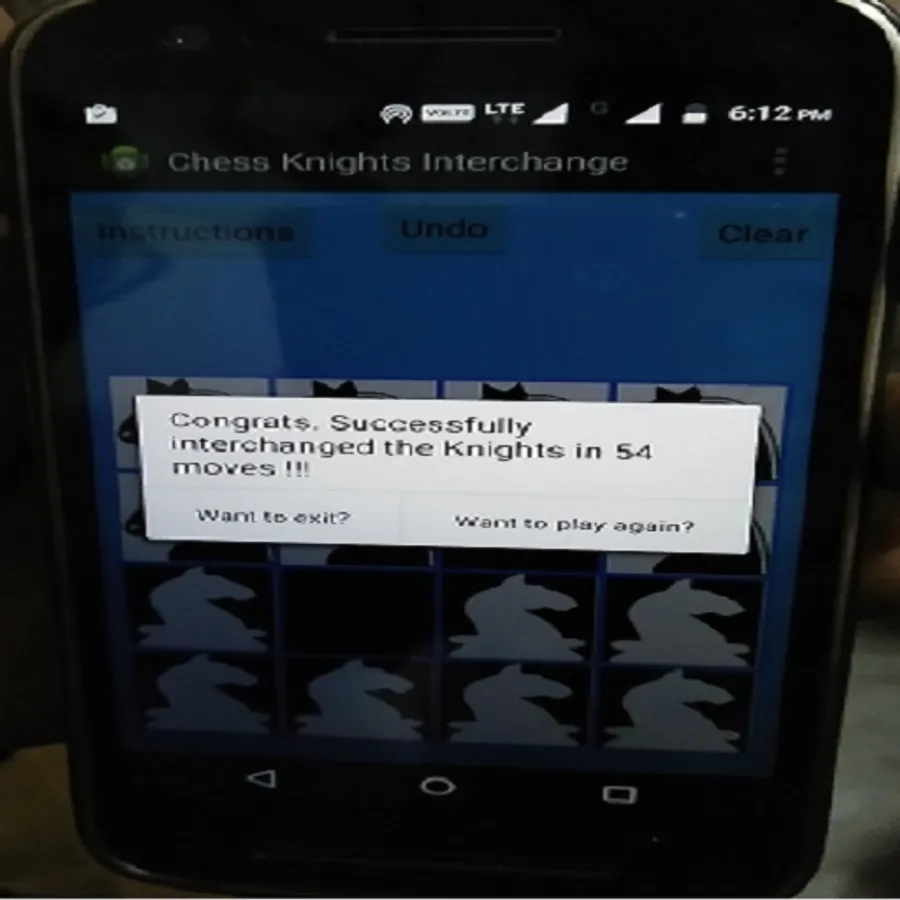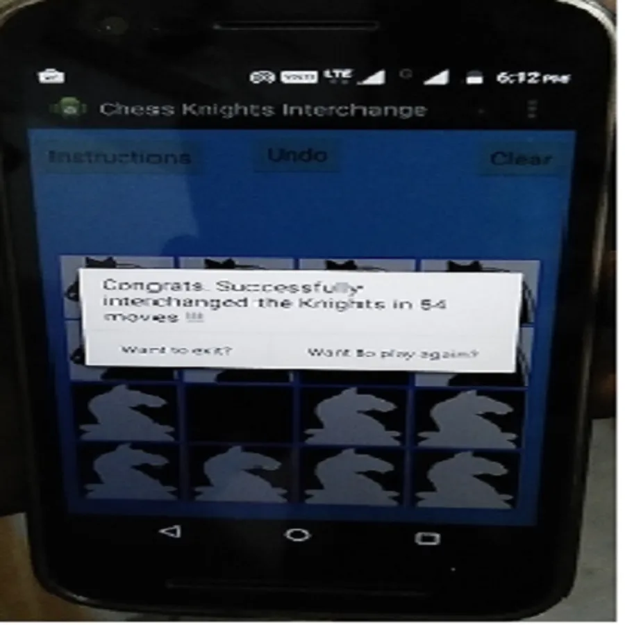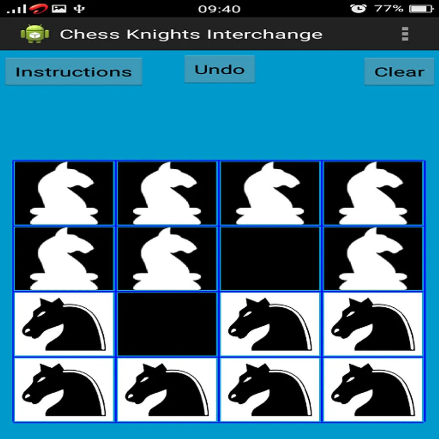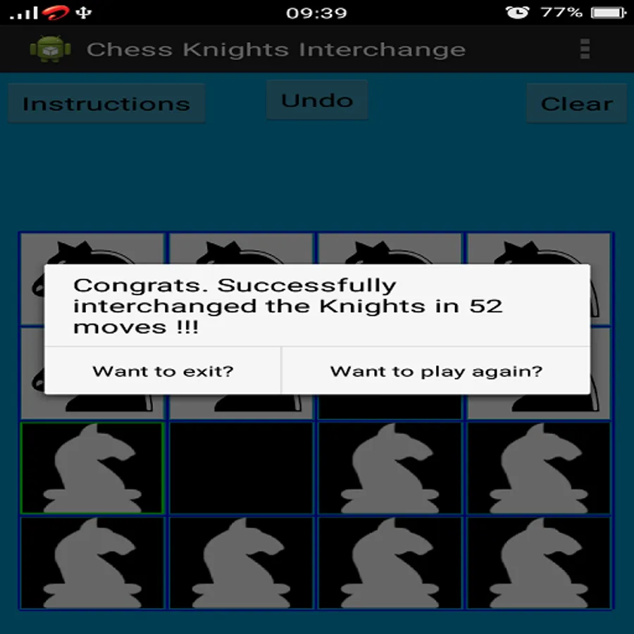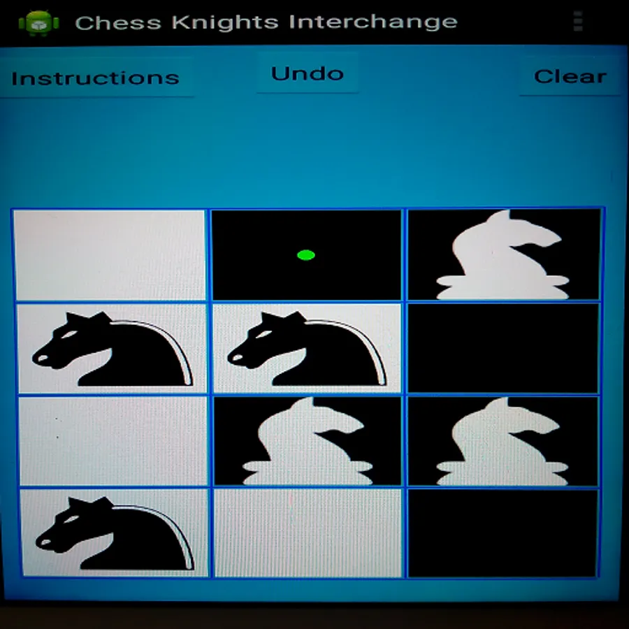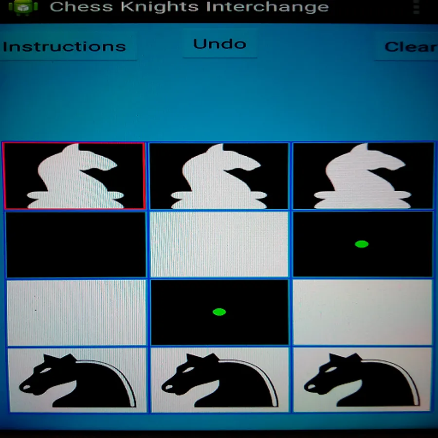 *** Select a Knight first by touching it and then click on a green cell to move it in that cell. If there is no green dot after selecting a Knight, that means the selected Knight has no valid move. In this case select another Knight which has valid move. A Knight can't move in to a already occupied cell (i.e a Knight can't attack another Knight).