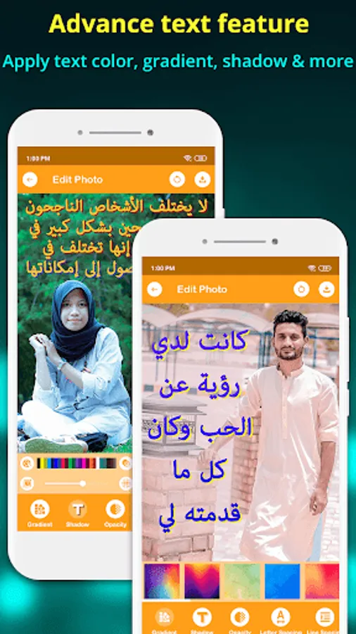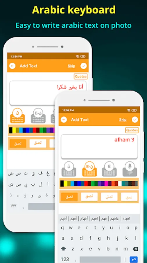 • Using Arabic Keyboard you can write Arabic text on your photo also set text color and font to make your text more effective.