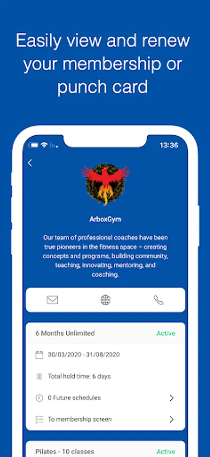 * Track your membership plan and session punch card usage and renew them directly from the app.