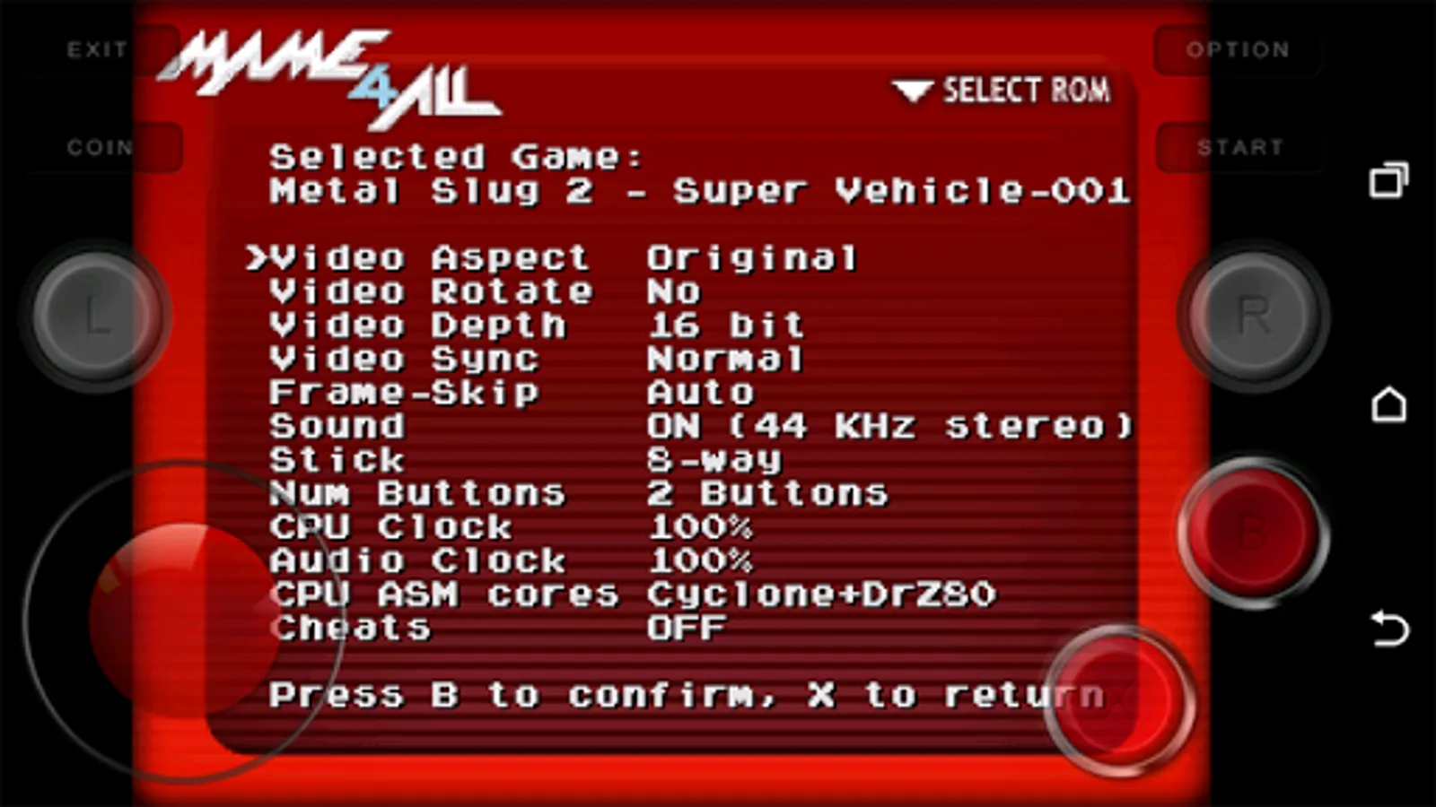 - Buttons START+SELECT simultaneously: Access to the MAME menu.