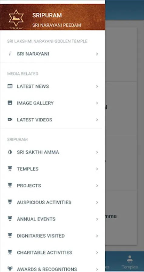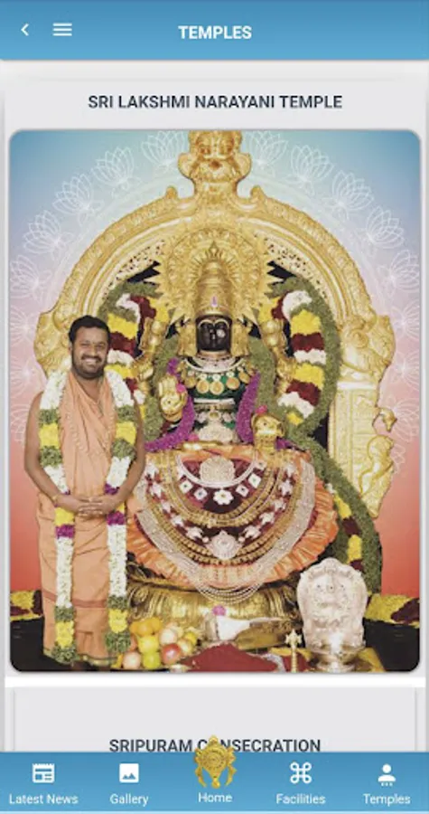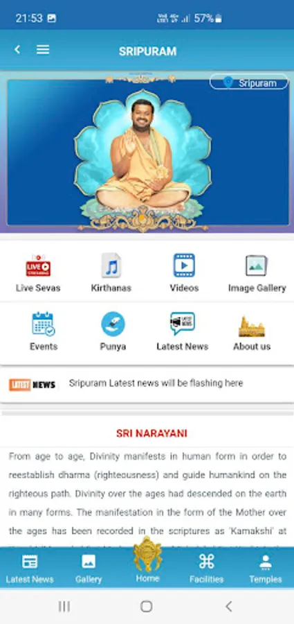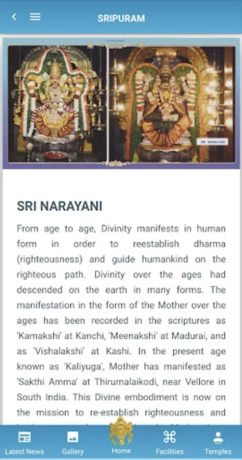 Sri Sakthi Amma stays at the Sri Narayani Peedam, an institution that sits at the edge of a mountain named Kailasha Giri. It is located in Thirumalaikodi (or Malaikodi), a small village near Vellore in South India. It is surrounded by mountains and lush, scenic beauty. Thirumalaikodi is located 150 km from Chennai and is equidistant from the two other very well known pilgrimage towns of Tirupathi and Tiruvannamalai. When linked by straight lines the three towns form a triangle.
