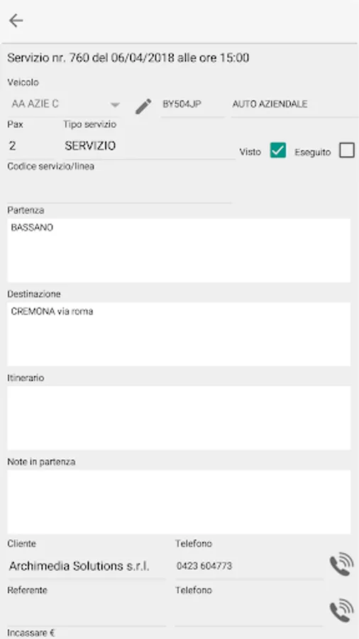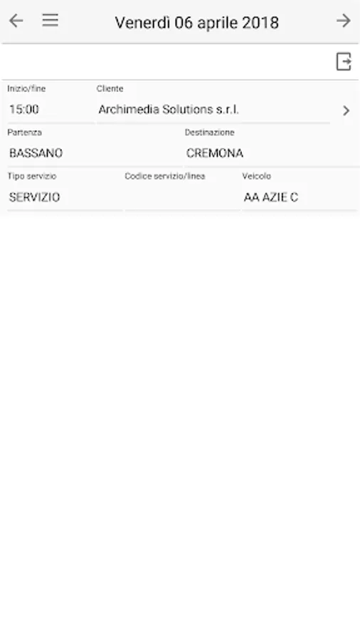The driver can access and search services assigned to him by this app. must have a login and password to view the information on: date / time start and end of the service, pax, middle, customer, contact, departure, destination, notes on the itinerary.