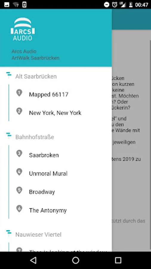 The app contains two different menu items. You can see in which areas the walls are and then let you run past the point "Navigate Me" to the artworks. If you stand directly in front of a factory, you can select the individual walls in "works of art". Thus, you can explore independently the ArtWalk.