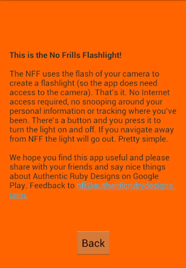 The No Frills Flashlight (NFF) uses the flash of your camera to create a flashlight (so the app does need access to the camera). That's it. No Internet access required, no snooping around your personal information or tracking where you've been. There's a button and you press it to turn the light on and off. If you navigate away from NFF the light will go out. Pretty simple.
