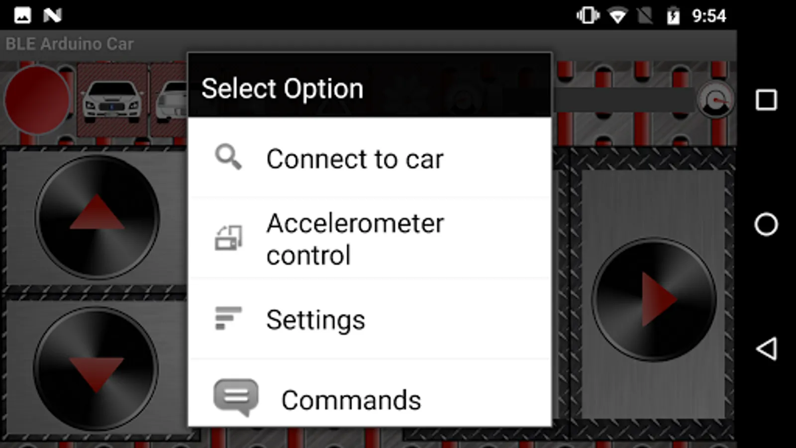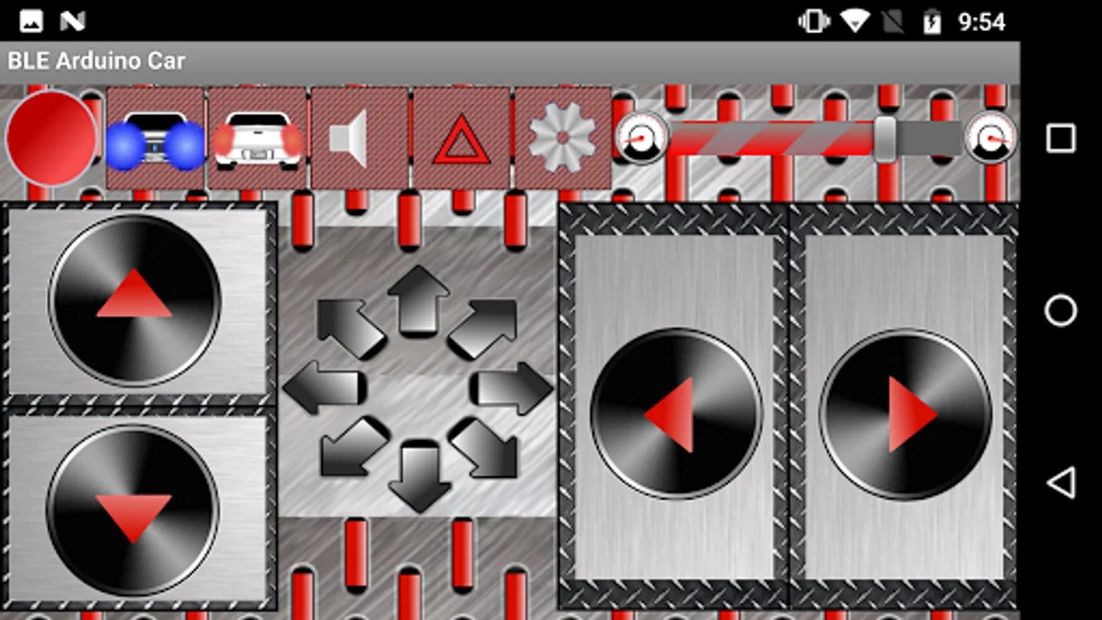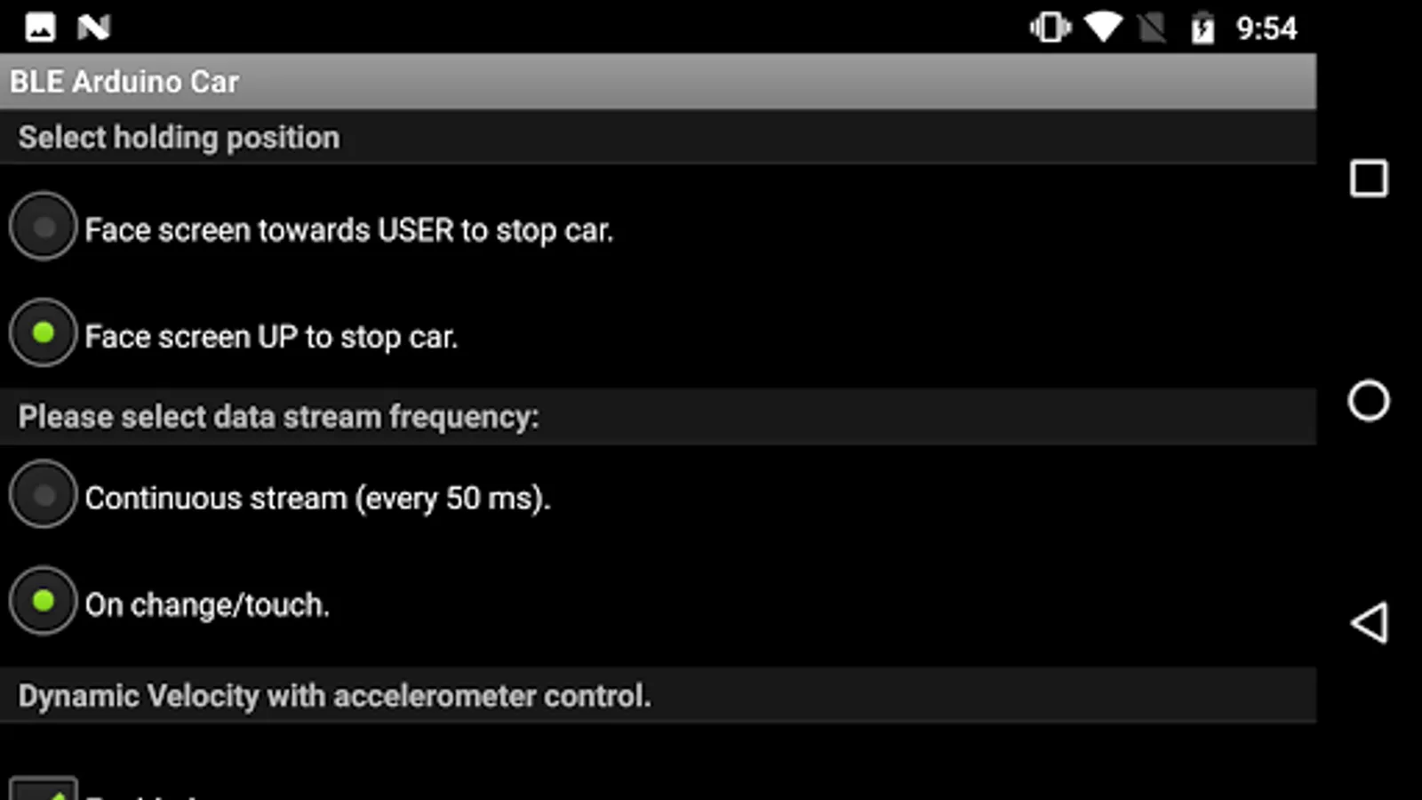This application is an upgrade to BLE for the original Bluetooth RC Car application. A couple of other features have been added. You can now change the character assigned to each button. You can also control the car's speed with the accelerometer control feature, which now can have its maximum and minimum thresholds trimmed. You can find the code and circuits at the tutorial website https://sites.google.com/site/bluetoothrccar/.