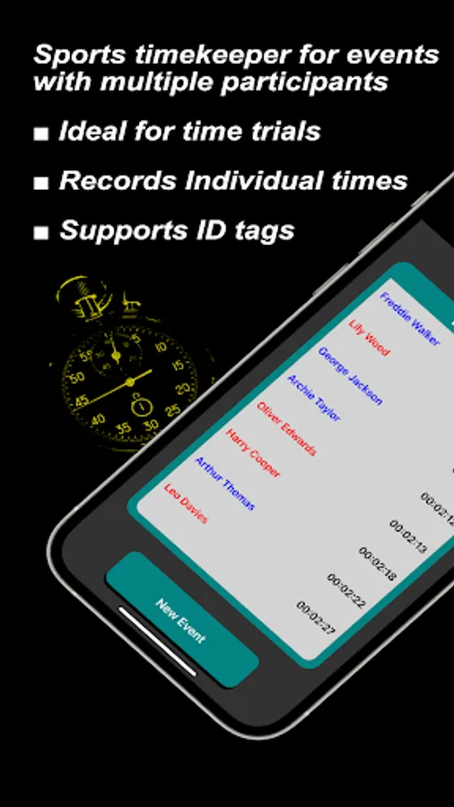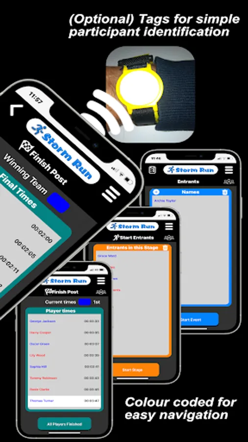 Participants are registered in the App by entering their details (name, number, and team). This information can be allocated to Tags to simplify identification. This information can be saved and recalled later.