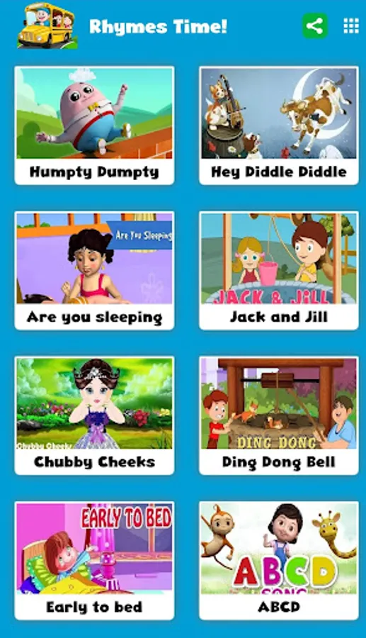 Below is a famous list of kids' rhymes and songs available in the app: