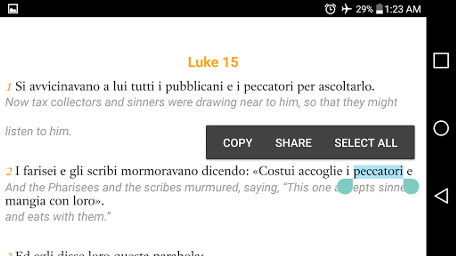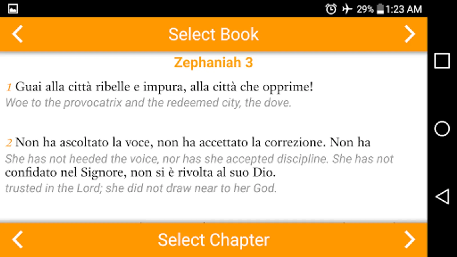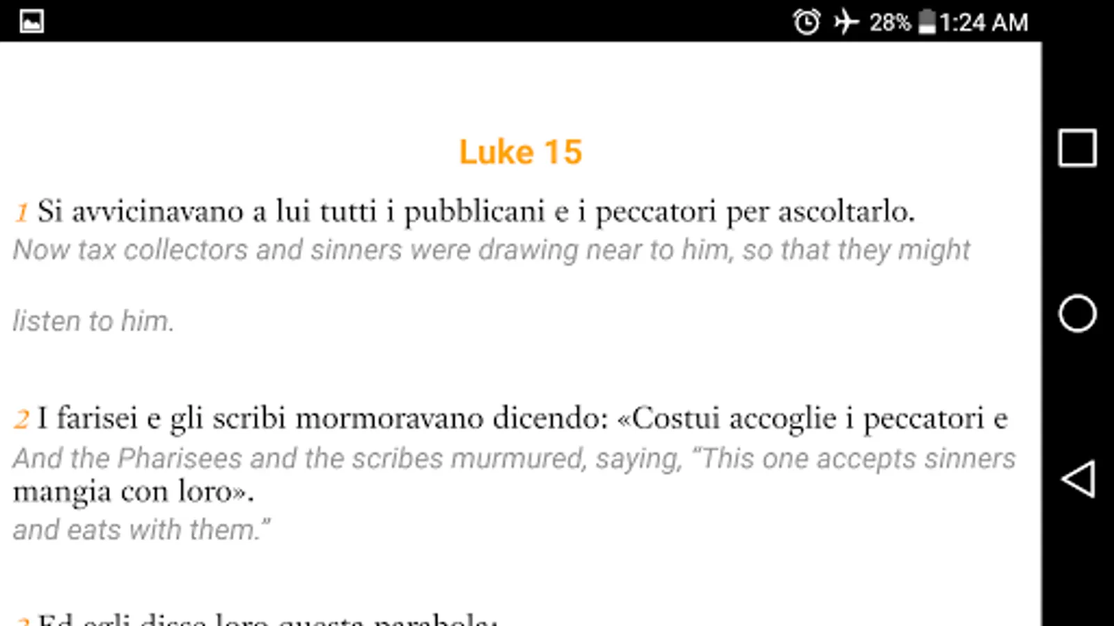 Practice your Italian by reading the Bible in interlinear Italian-English (CEI-2008 version, and English Nova Vulgata Translation), both scroll-able and zoom-able with responsive display.