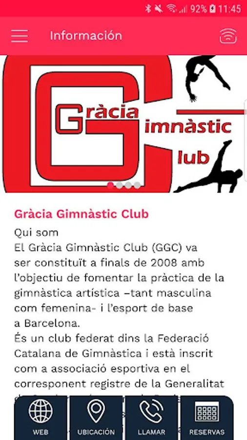 The Gràcia Gimnàstic Club (GGC) will be constituted at the end of 2008 with an objective to promote the practice of artistic gymnastics - both feminine and masculine - and basic sports and competition to Barcelona. This is a federated club of the Catalan Federation of Gymnastics and is registered as a sports association in the corresponent register of the Generalitat de Catalunya (number of Registre d'Entitats Esportives 14009). more alts of competition and pren part in the Campionats de Catalunya and d'Espanya. Les activitats duu terme the GGC are adreçades to individuals, from 3 years of qualsevol nivell, so són del barri com d’altres indrets, which vulguin practice l'esport of artistic gymnastics. In actuality, the club has a total of 370 gymnasts enrolled in the different groups, from the school level to the highest levels of competition, passant pel grup d’adults. The seva activitat promou l’esport com a factor of social cohesion in the neighborhood, now, contributes to enrich the seu teixit associatiu.