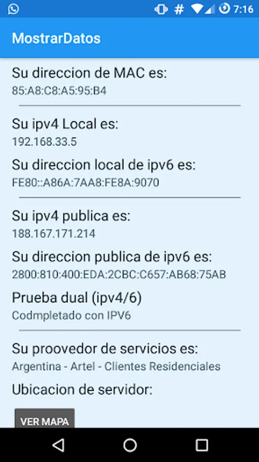 It is an application focused on knowing the data on the public IP (ipv6 and ipv4), private ip (ipv6 and ipv4), to know your MAC address, the location of your service provider, all with a simple click.