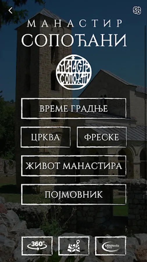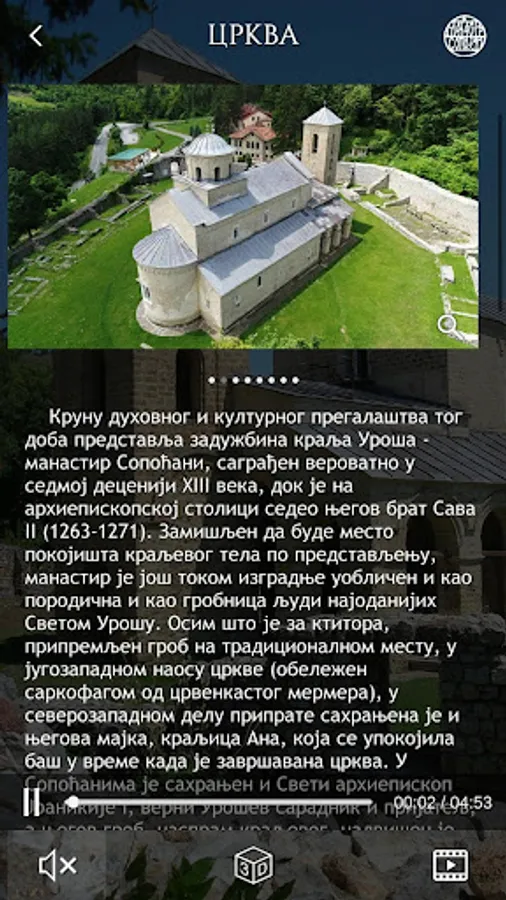 Aplikacija je višejezični multimedijalni vodič kroz Manastir Sopoćani i pruža posetiocima detaljne informacije o istorijatu, arhitekturi, freskama i manastirskom životu. Sadrži audio i video zapis, 3D modele i bogate galerije fotografija iz sadašnjeg i prošlih vremena i 360 virtuelnu turu radi ostvarivaranja potpunijeg utiska o Manastiru Sopoćani.