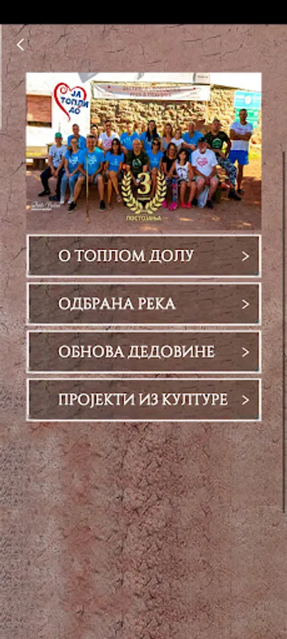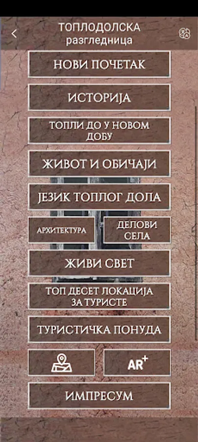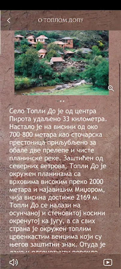 The application shows the turbulent history of the village of Topli Do on Stara planina in Serbia from the establishment of the settlement to the present day. It describes the economic and demographic ups and downs of this village over the centuries, the struggle for survival under the Ottoman and Bulgarian occupiers, the efforts of inhabitants to preserve the natural environment, shows the beauty of the mountain rivers and numerous waterfalls and points out the significant tourist potential of this mountain region.