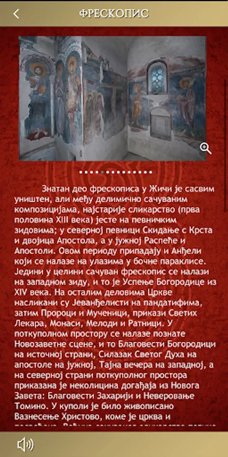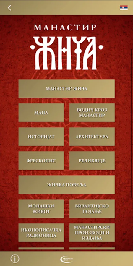 The application is a multilingual multimedia guide through the Zica Monastery, initiated by the sisterhood of the Monastery and provides visitors with detailed information about the history and founding charter, architecture, murals and other fine art, relics, icon painting workshop, Byzantine chant, monastery life, publishing and products of the Monastery. It contains audio and video, 3D models and rich photo galleries from present and past times to give a more complete impression of the Žiča Monastery. Of particular value is the word Saint Sava in the form of text and audio.