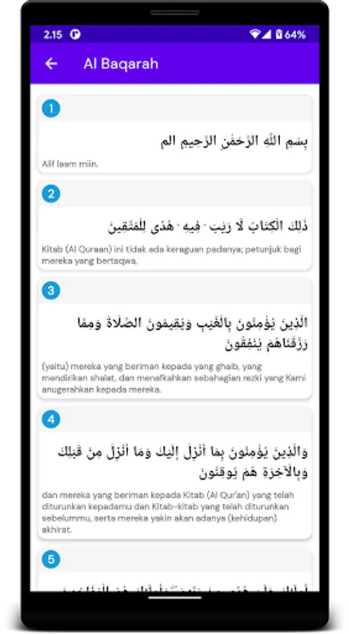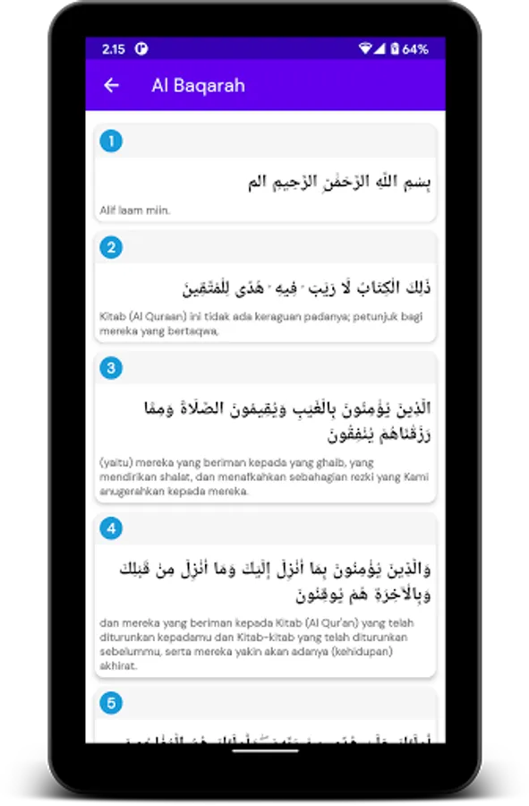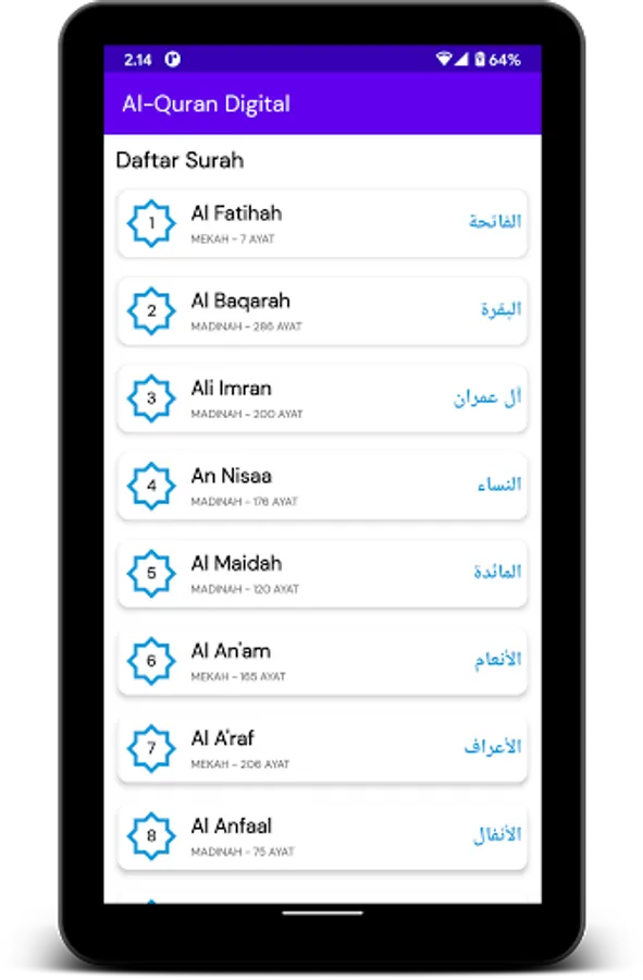 This application contains the letters in the Quran. complete with a brief description of the selected letter. besides that it is equipped with a translation in Indonesian, which is expected to make it easier for you to read and study the verses.