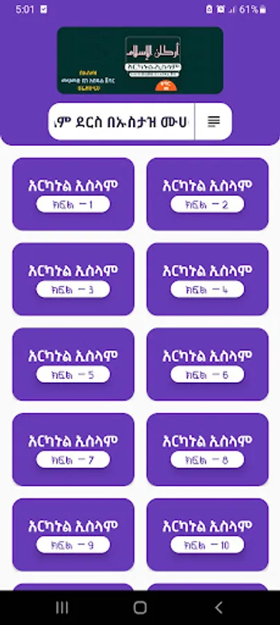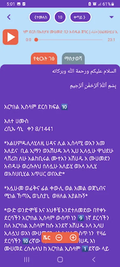 ይህ የሞባይል መተግበሪያ የአርካኑል ኢስላም ደርስ በኡስታዝ ሙሀመድ ቢን አብዱል ጀባር (خليك)ሀፊዘሁሏህ የተሰጠውን ትምህርት(ደርስ) ለአጠቃቀም ምቹ በሆነ መንገድ ከ 1–60 ያለውን ክፍል አጠቃሎ የያዘ መተግበሪያ ነው።