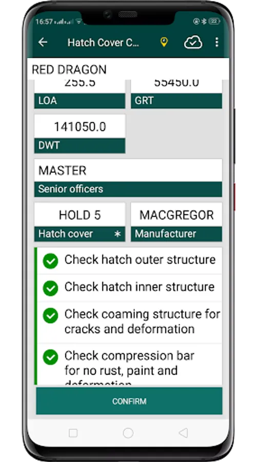Log actions for hatch cover inspections in real time. Results sync’ed to the cloud, and accessible online. Time distribution statistics and live monitoring always available from the cloud.