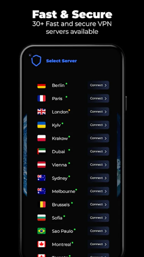 Armor&Shield VPN is easy to use and you can connect to our VPN servers with just one tap. The application has more than 30 servers in different cities.