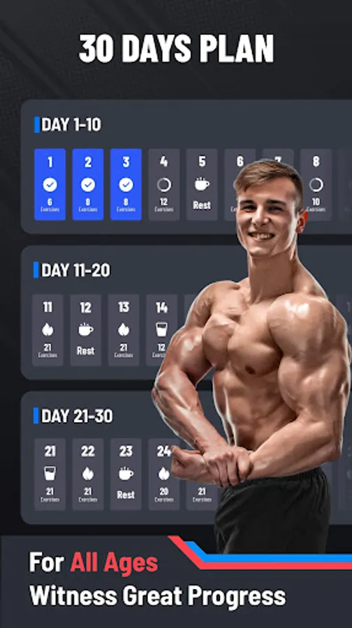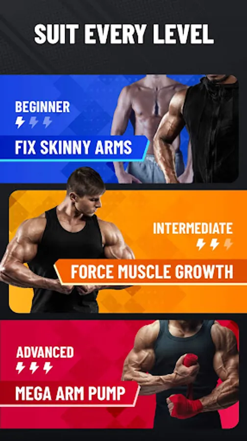 3 levels of workout plans help you build arm muscles step by step. Whether you are a beginner or a pro, you can find workouts that are suitable for you. Different exercises are prepared every day to keep it fresh and exciting.