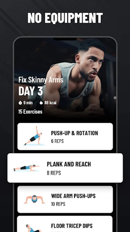 With only 10 minutes a day, your biceps and triceps will be pumped up. No equipment needed, all workouts can be performed with your body weight at home.