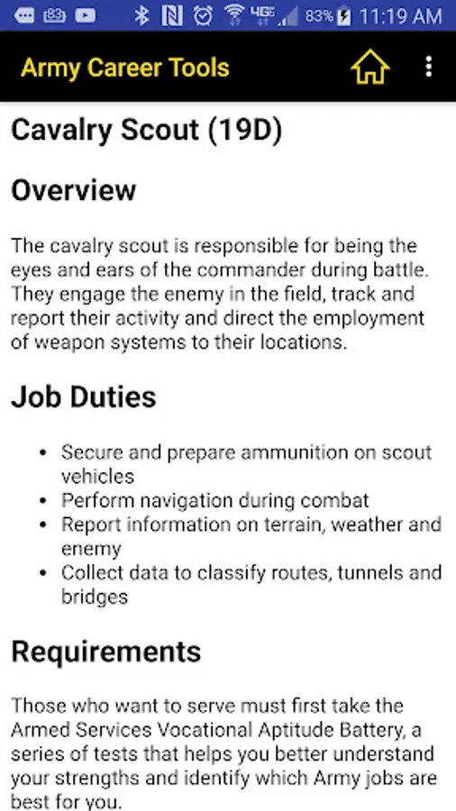 For Army recruiters and others who need these career tools in a convenient app. Up to date Army careers searchable by category or MOS. Search possible jobs by ASVAB scores to find out what you or your possible recruit is qualified for.