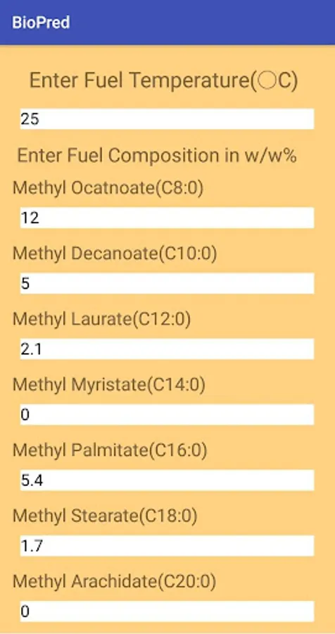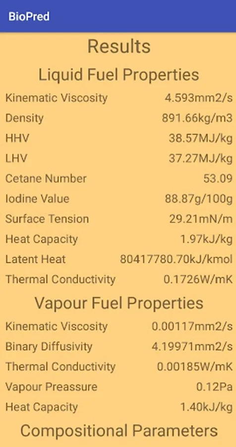 The app predicts the following properties and compares them with the European Standard(EN14214) for fatty acid methyl esters(FAME).