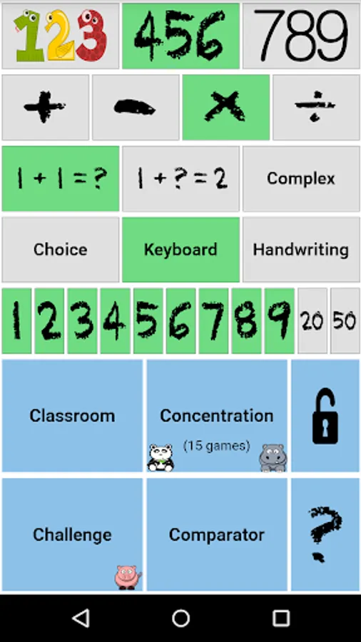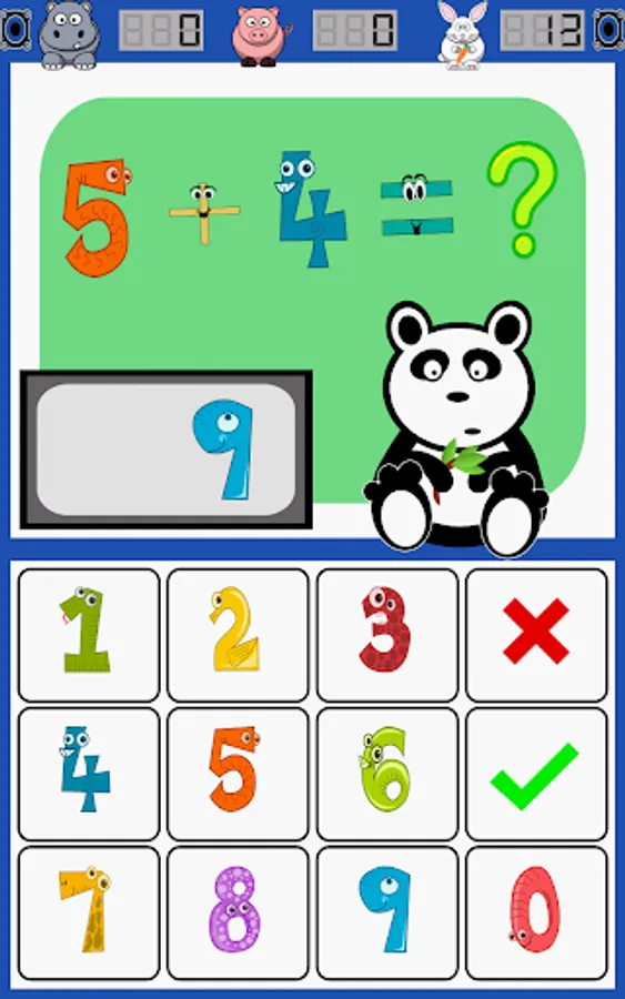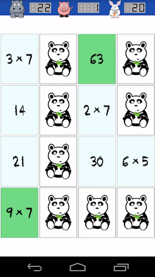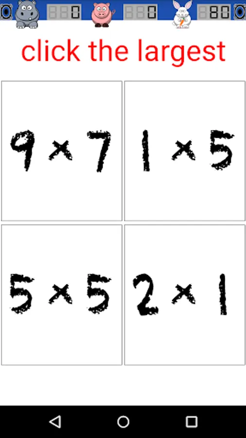 In Classroom mode, choose addition, subtraction, multiplication, and division along with level of complexity, and Math Panda serves up math problems in a playful, untimed environment. Hippo counts correct answers, Pig counts incorrect answers, and Rabbit displays elapsed time. In Challenge mode, try to solve as many problems as you can in two minutes to unlock new rounds of Concentration. Also known as Memory or Pairs, Math Panda’s version of Concentration matches math problems with solutions. Match 2+2 with 4 or 6x7 with 42. Math Panda Concentration makes practice so fun it’s addictive! Finally, treat yourself to a multi-choice game of Comparator, or challenge your friends to see who gets the highest score!