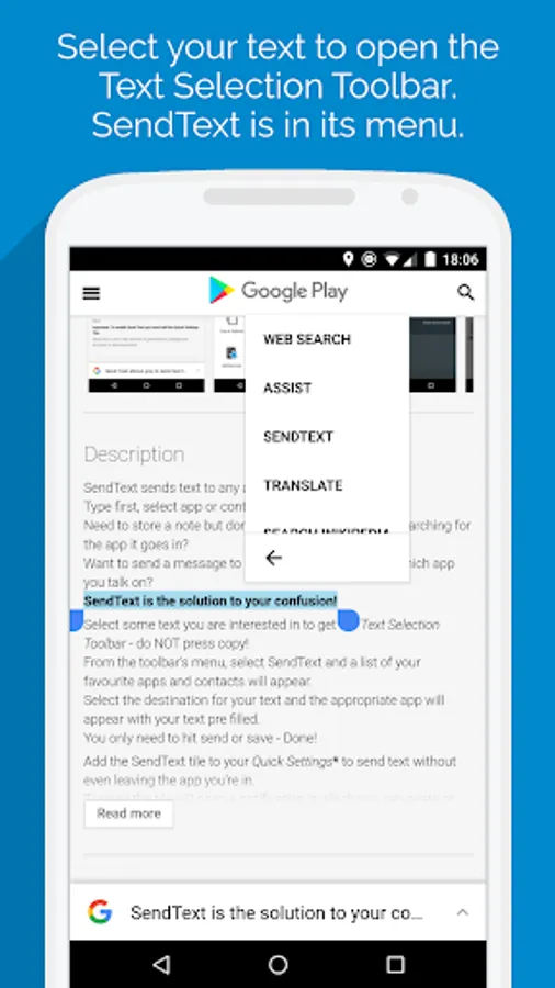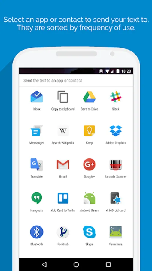 With SendText you can share text from any app directly to your favourite apps or frequent contacts in a single tap. Copy / paste not required!