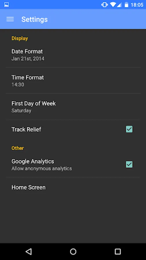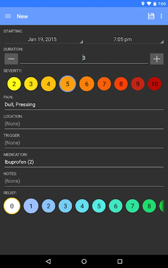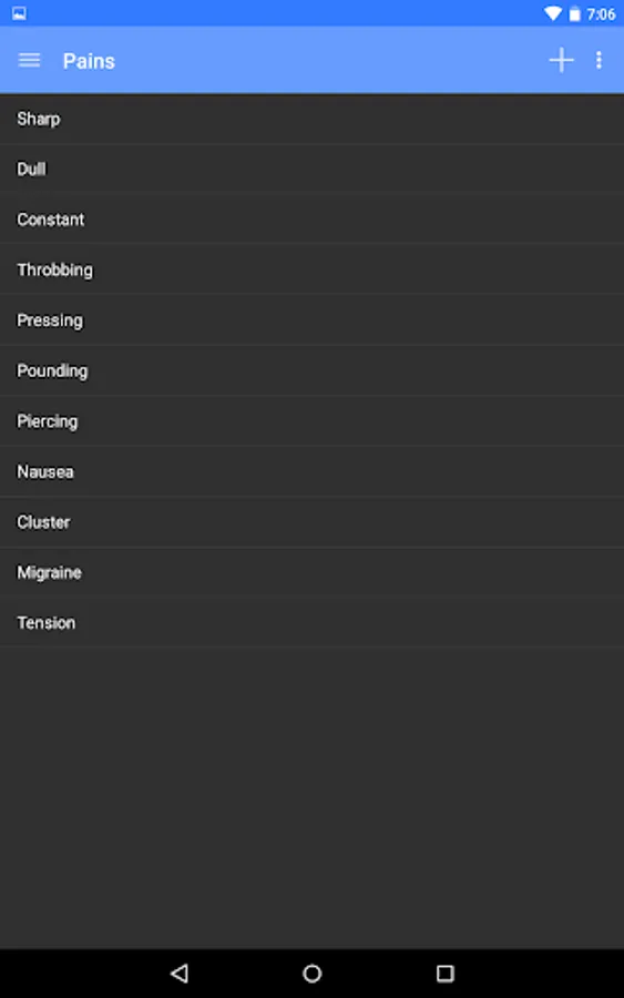 • Track the type of pain associated with a headache such as migraine, throbbing, dull, sharp nausea and many more. Custom pains can be added as well